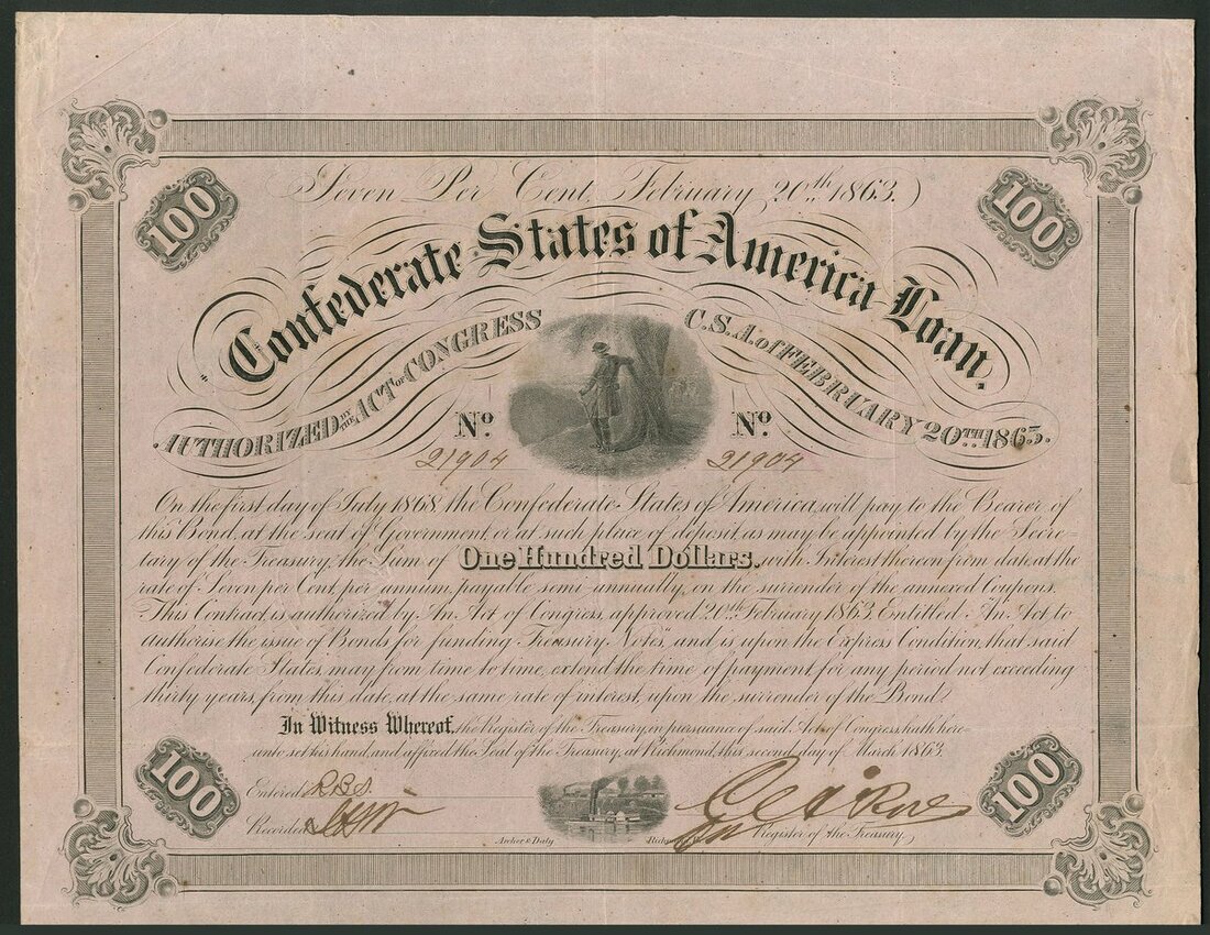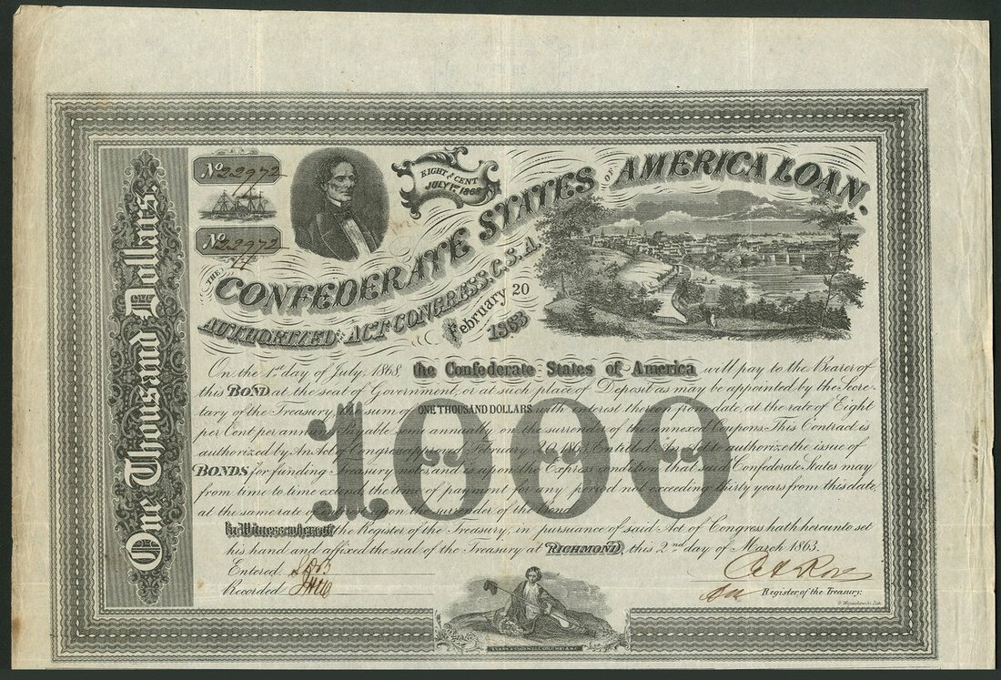 Confederate States: Act of 20th February 1863, 4 bonds issued under this Act comprising $1000, view of Richmond; $100, soldiers leaning on tree, and, $500, soldier by fire, 2 examples, one of white and one on pink paper, all with coupons. F-VF (4).