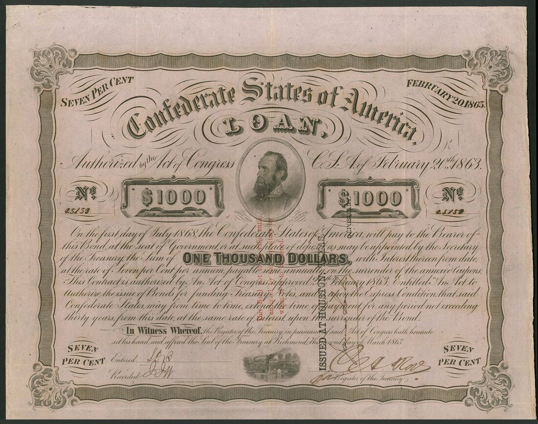 Confederate States of America, Act of 20th February 1863, $1000, redeemable 1 July 1868, #25153, Stonewall Jackson, black, pink paper, with 3 line Depository overprint in red, plus Houston overprint in black, handsigned by James Sorley (Ball 255), with coupons. GVF.