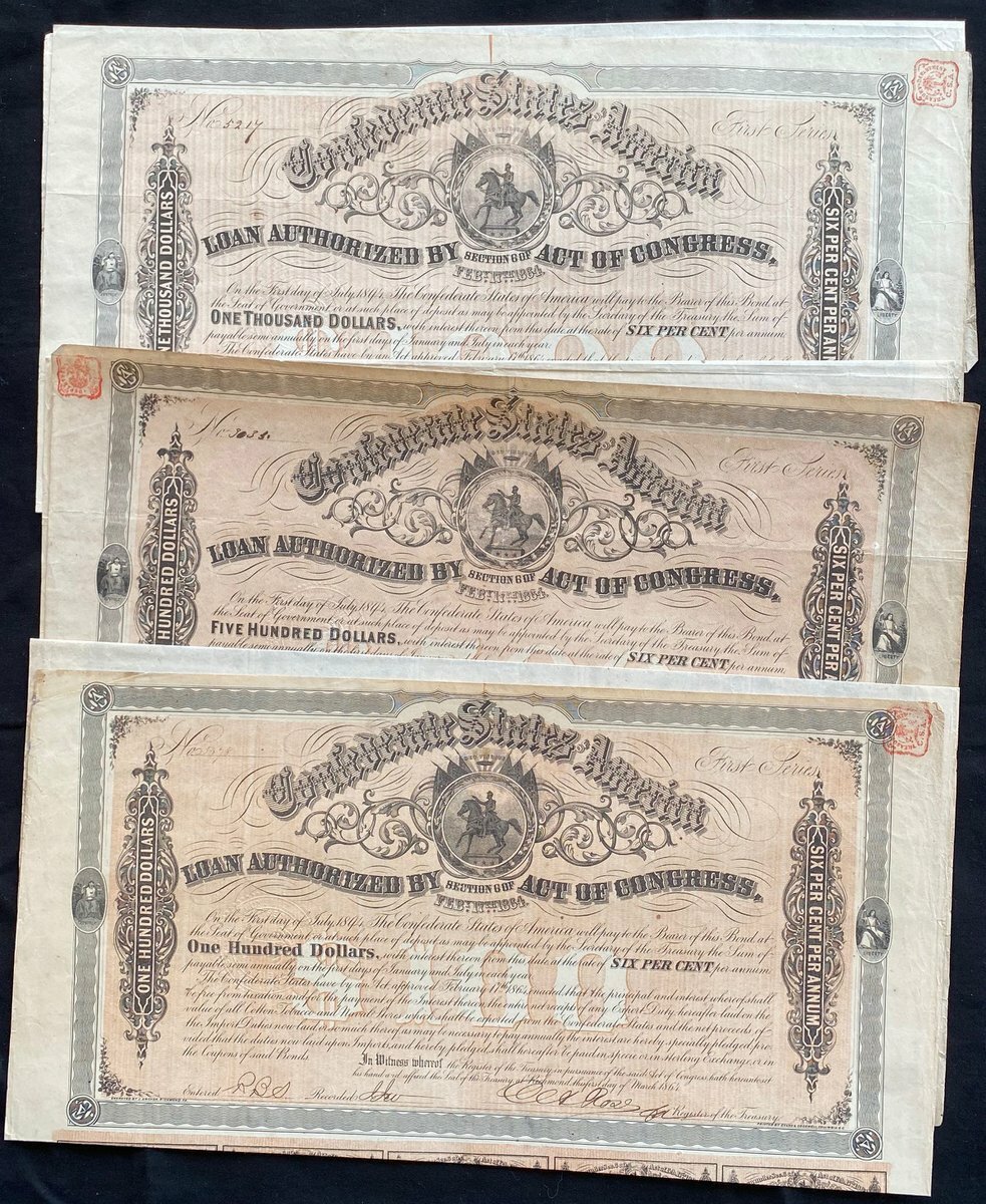 Confederate States: Act of 17th February 1864, set of 3 bonds of the First Series, redeemable 1st July 1894, $100, $500 and $1000, Equestrian statue of Washington (Ball 296, 304 and 317), with coupons. VF (3).
