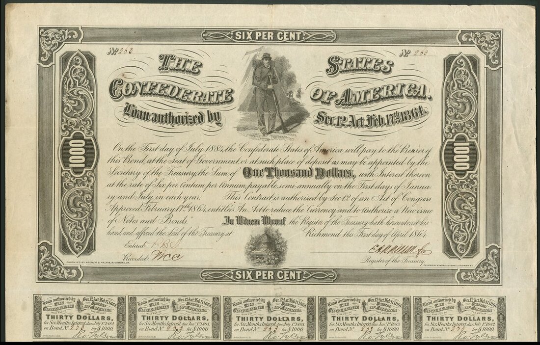 Confederate States of America, Act of 17 February 1864, $1000, redeemable 1 July 1884, #263, Confederate Soldier in front of tent, black (Ball 360), with coupons. VF and scarce.
