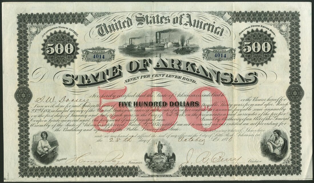 U.S.A: State of Arkansas, 7% levee bond for $500, 187[1], #4014, steam boats at top, female figures in bottom corners, black with red $500 in underprint, with coupons. GVF.