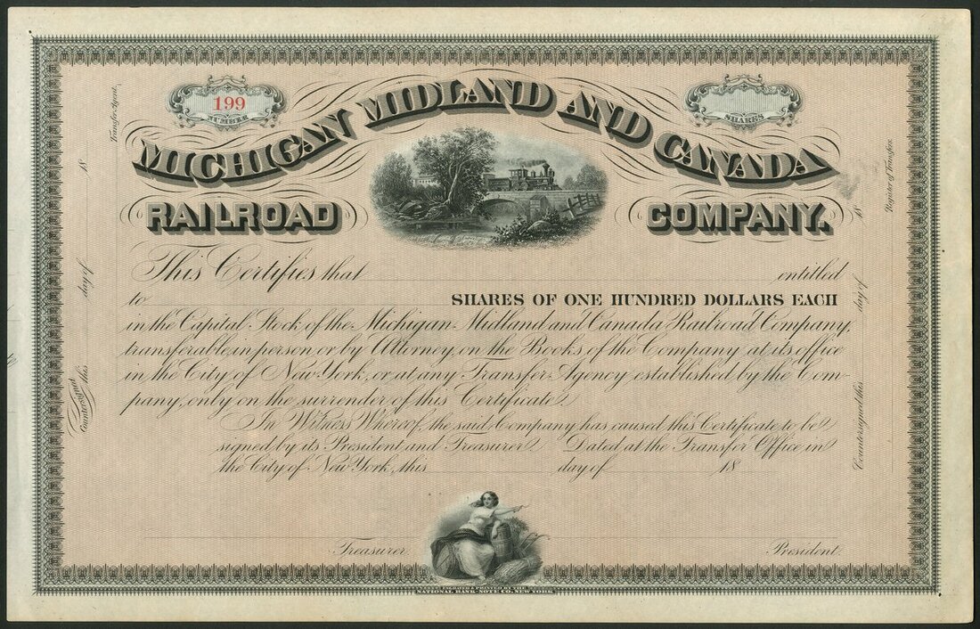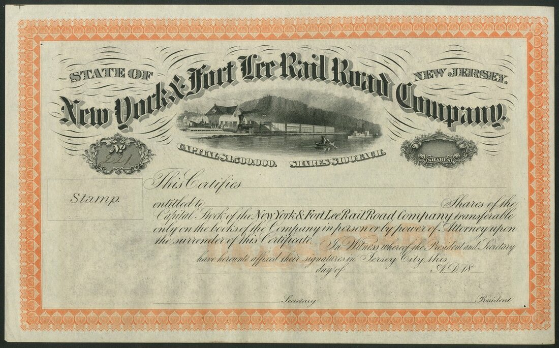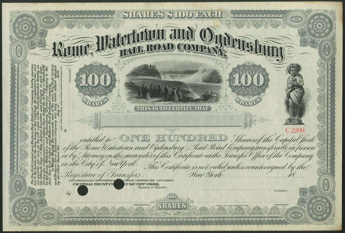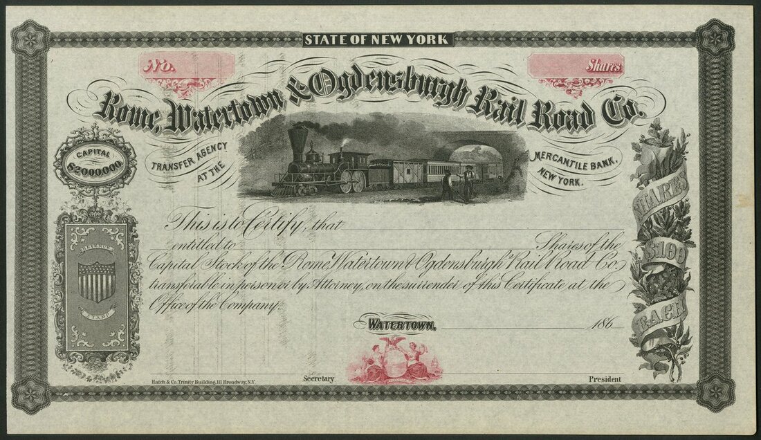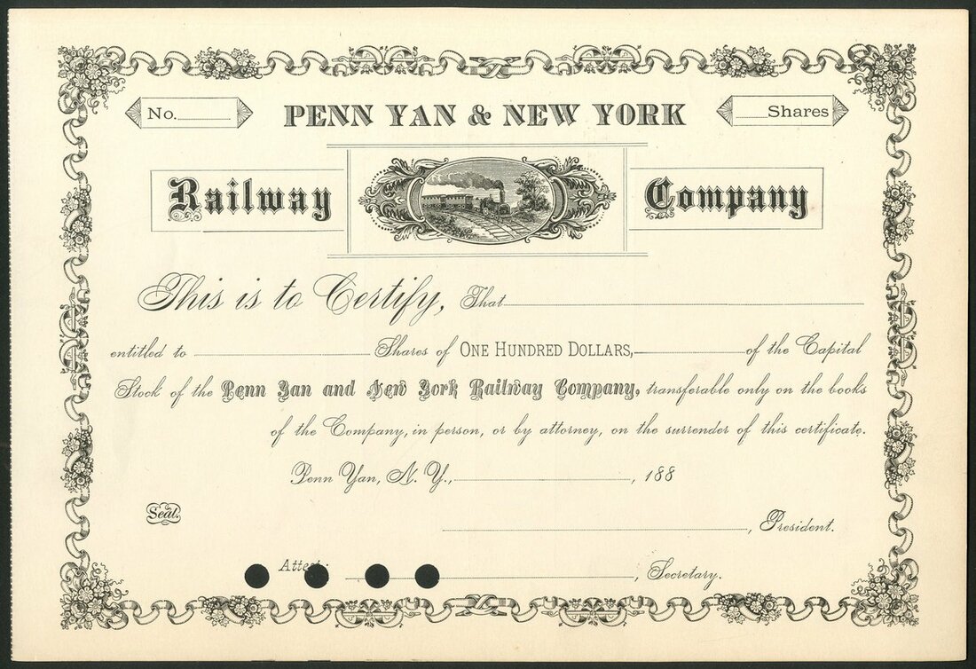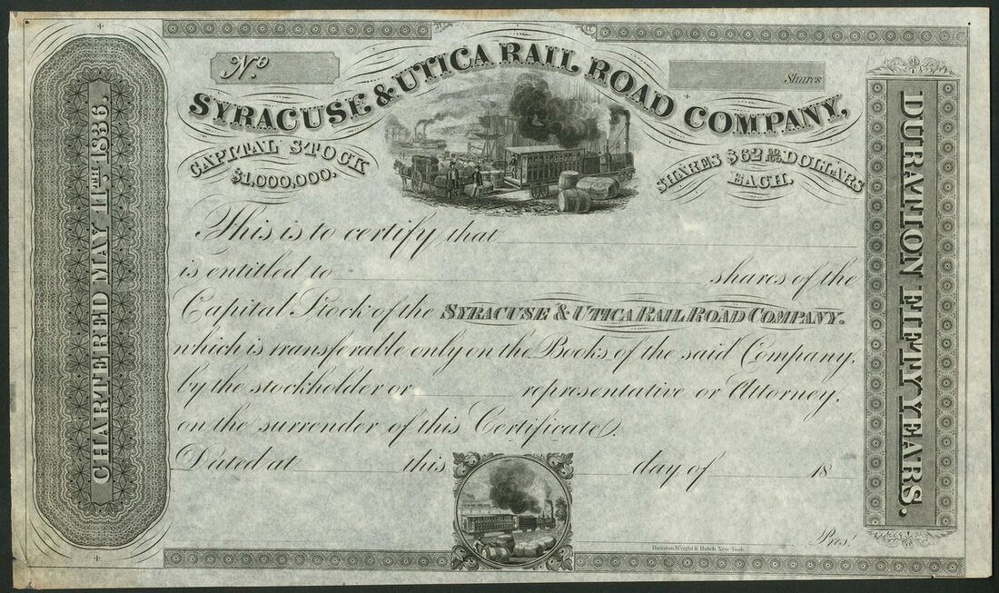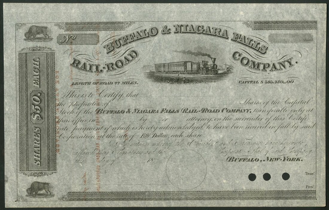 U.S.A: A collection of unissued Railroad certificates, most with vignettes, some scarce, comprising; Buffalo & Niagara Falls Railroad Co; Syracuse & Utica Railroad Co; New Jersey Junction Railroad Co; Spuyten Duyvil and Port Morris Railroad Co; Michigan Midland and Canada Railroad Co; Stockbridge and Pittsfield Railrad Co; Omaha, Abilene & Wichita Railway Co; Rome, Watertown & Ogdensburgh Railroad Co (2); New York & Fort Lee Railroad Co; Northern Pacific Railroad Co; Penn Yan & New York Railway Co, and White Water Railroad Co. Generally VF, some better. (13)
