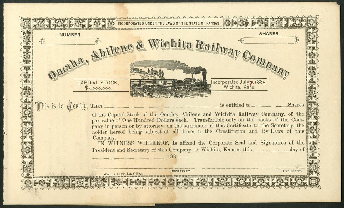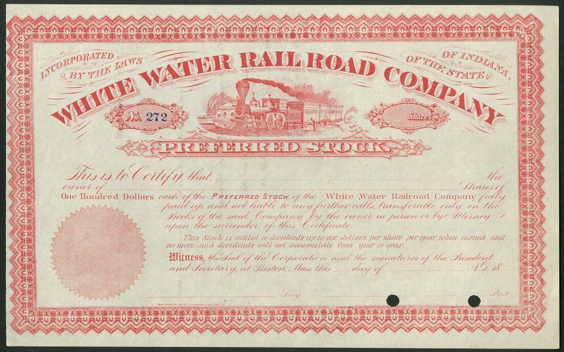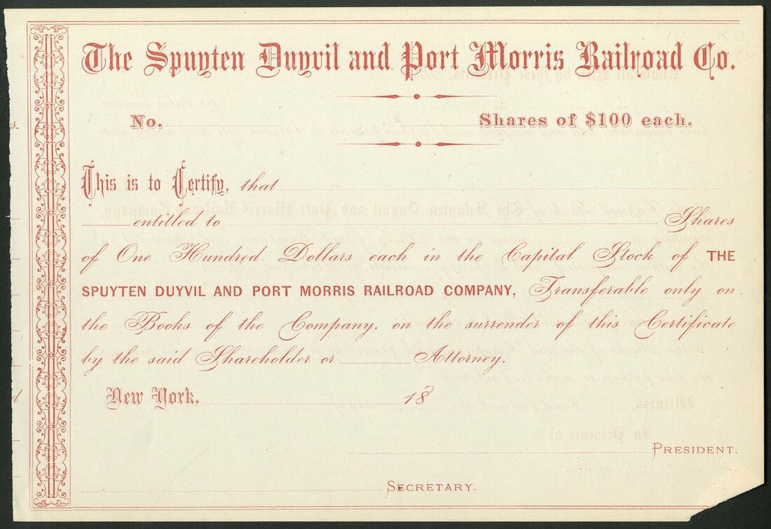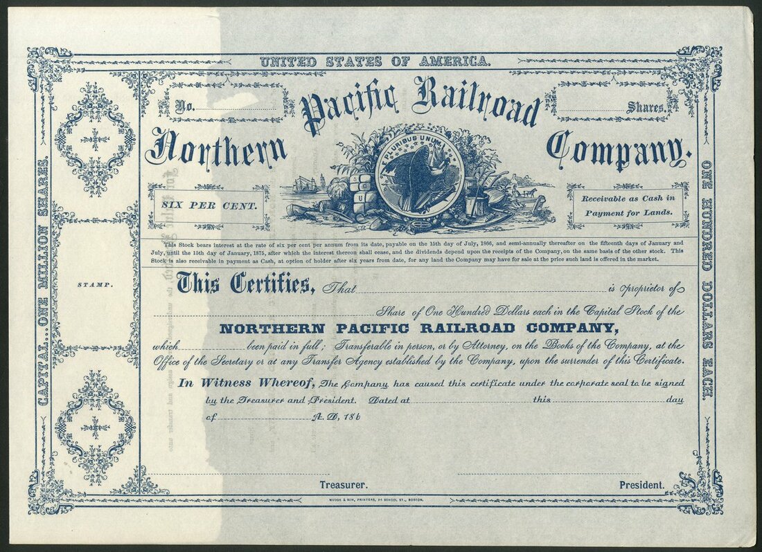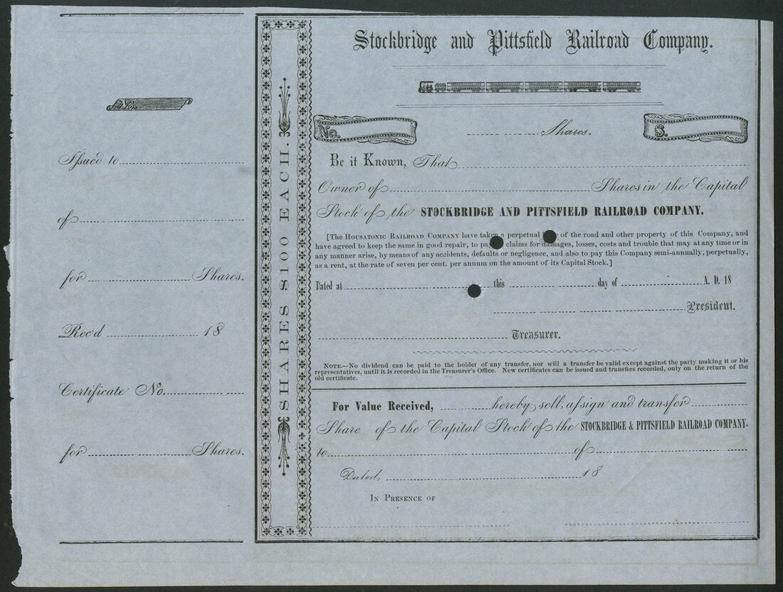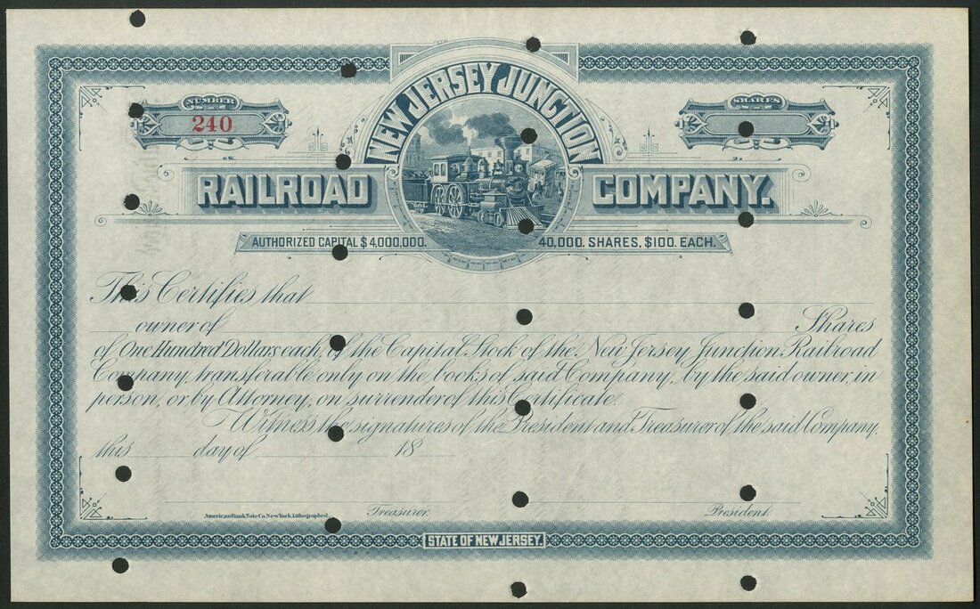 U.S.A: A collection of unissued Railroad certificates, most with vignettes, some scarce, comprising; Buffalo & Niagara Falls Railroad Co; Syracuse & Utica Railroad Co; New Jersey Junction Railroad Co; Spuyten Duyvil and Port Morris Railroad Co; Michigan Midland and Canada Railroad Co; Stockbridge and Pittsfield Railrad Co; Omaha, Abilene & Wichita Railway Co; Rome, Watertown & Ogdensburgh Railroad Co (2); New York & Fort Lee Railroad Co; Northern Pacific Railroad Co; Penn Yan & New York Railway Co, and White Water Railroad Co. Generally VF, some better. (13)