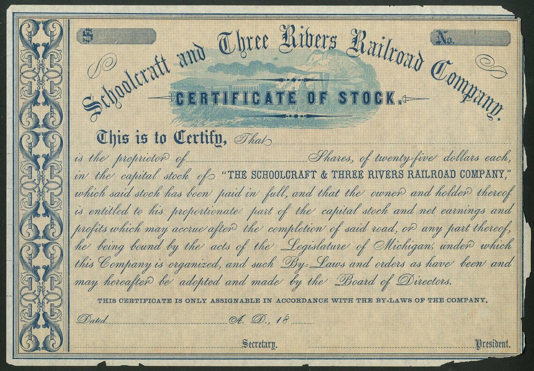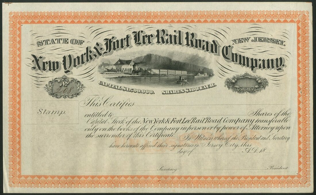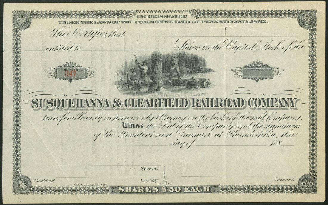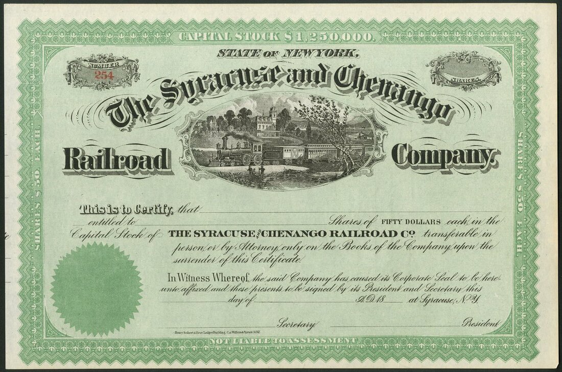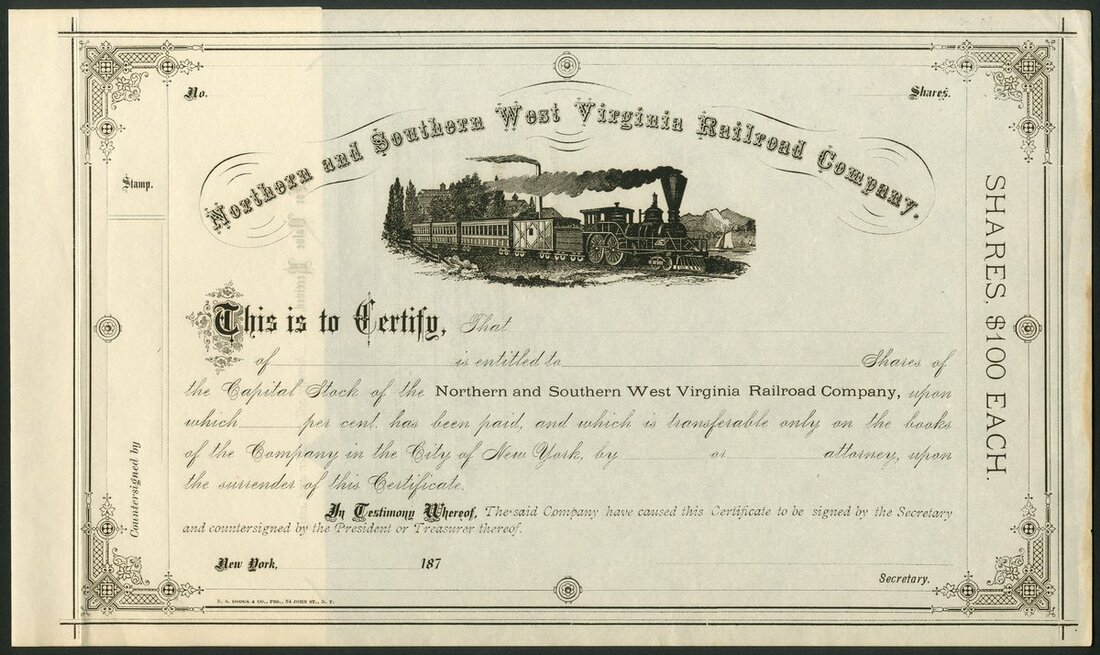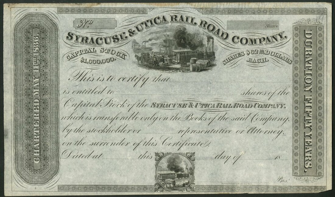 U.S.A: A group of unissued Railroad certificates, most with vignettes, some scarce, comprising; Syracuse & Utica Railroad Co; New York & Fort Lee Railroad Co (2); Susquehanna & Clearfield Railroad Co; Toledo and Ohio Central Railway Co; Syracuse and Chenango Railroad Co; Solomon Valley, Phillipsburg and Northern RR Co; Shawnee, Hocking Valley and Southern RR Co; Schoolcraft and Three Rivers RR Co; St. Joseph, South Bend & Southern RR Co; Northen and Southern West Virginia RR Co; Marquette, Houghton and Ontonagon RR Co, and McKeesport and Belle Vernon RR Co. Most VF and better. (13).