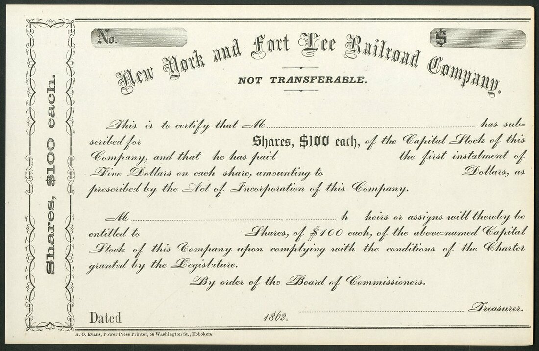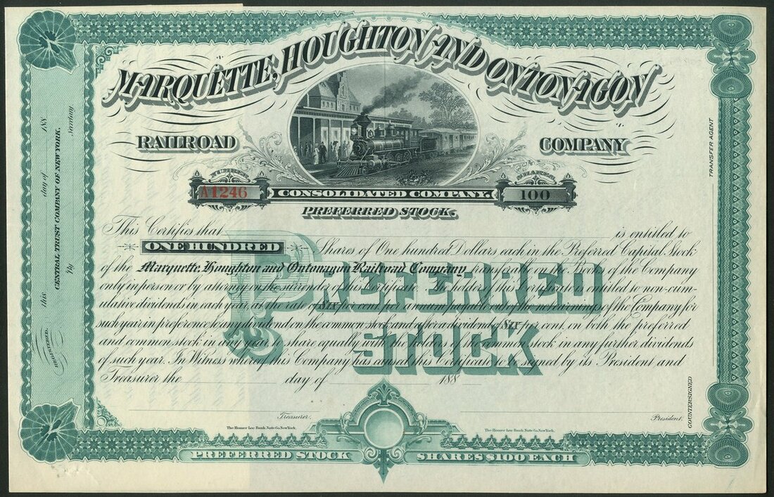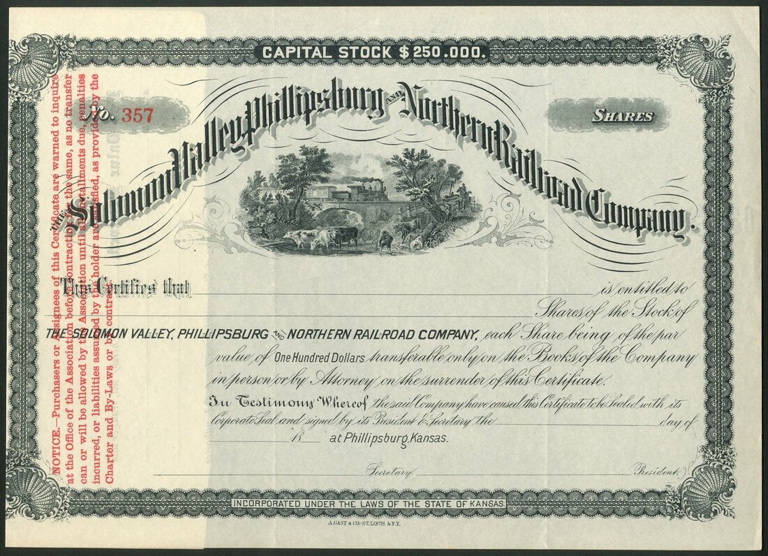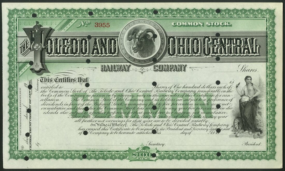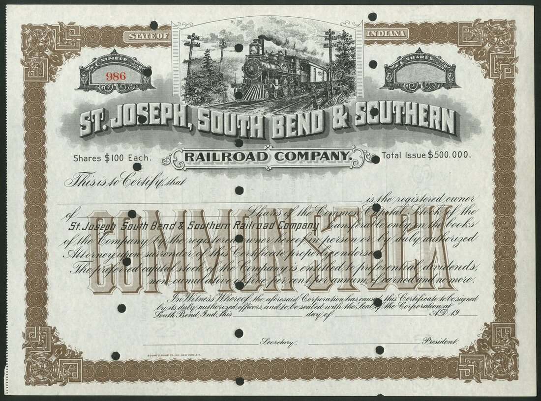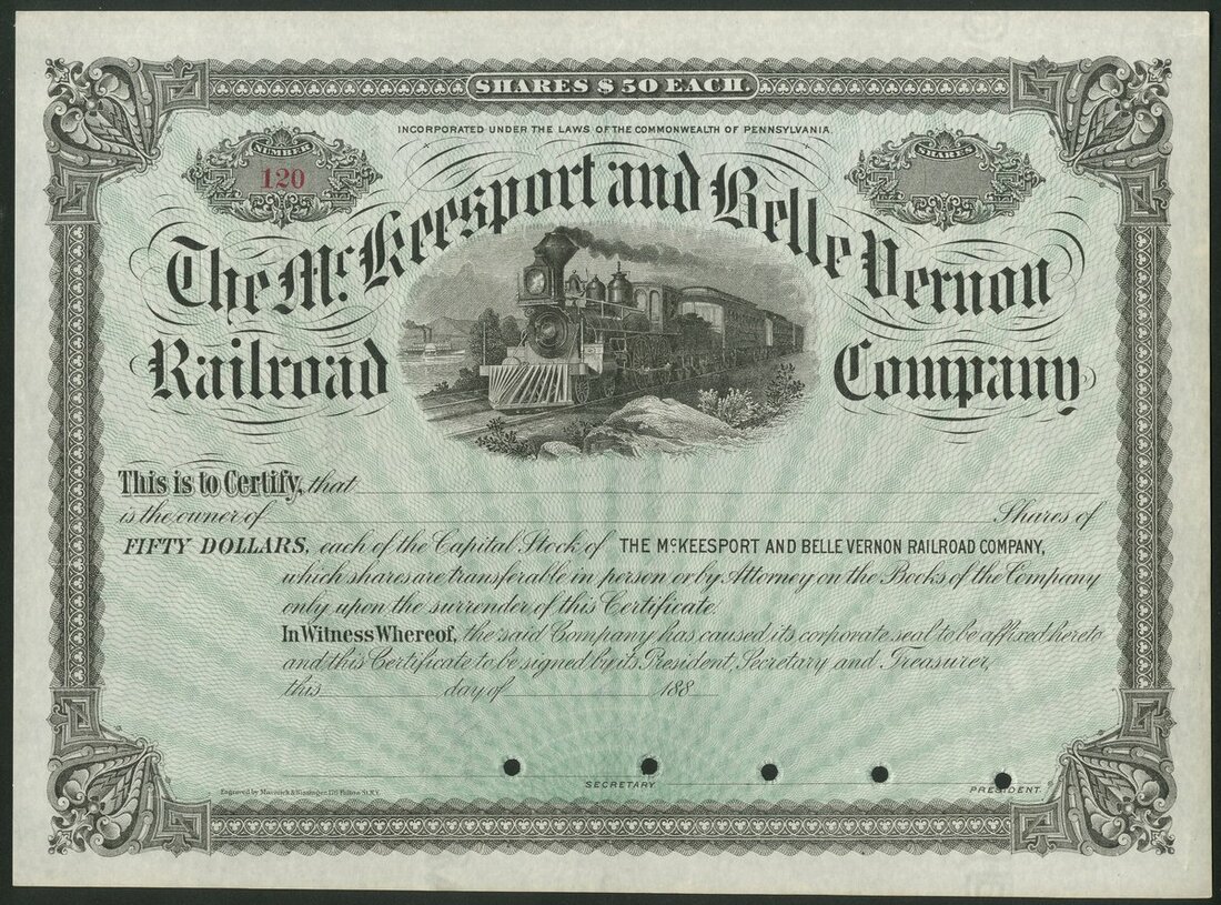 U.S.A: A group of unissued Railroad certificates, most with vignettes, some scarce, comprising; Syracuse & Utica Railroad Co; New York & Fort Lee Railroad Co (2); Susquehanna & Clearfield Railroad Co; Toledo and Ohio Central Railway Co; Syracuse and Chenango Railroad Co; Solomon Valley, Phillipsburg and Northern RR Co; Shawnee, Hocking Valley and Southern RR Co; Schoolcraft and Three Rivers RR Co; St. Joseph, South Bend & Southern RR Co; Northen and Southern West Virginia RR Co; Marquette, Houghton and Ontonagon RR Co, and McKeesport and Belle Vernon RR Co. Most VF and better. (13).