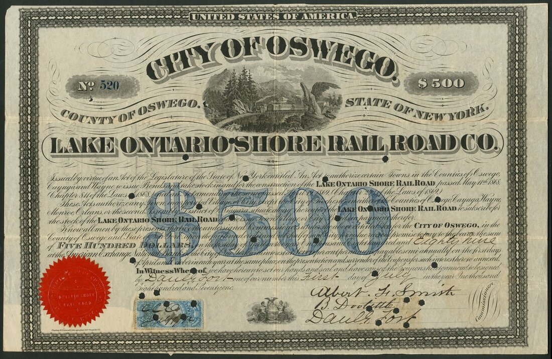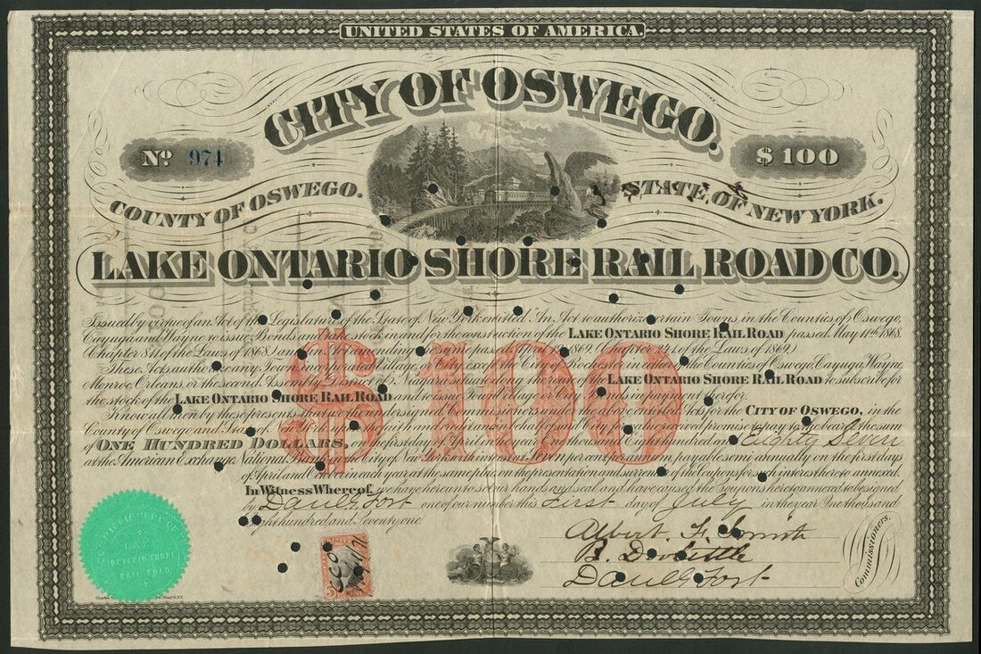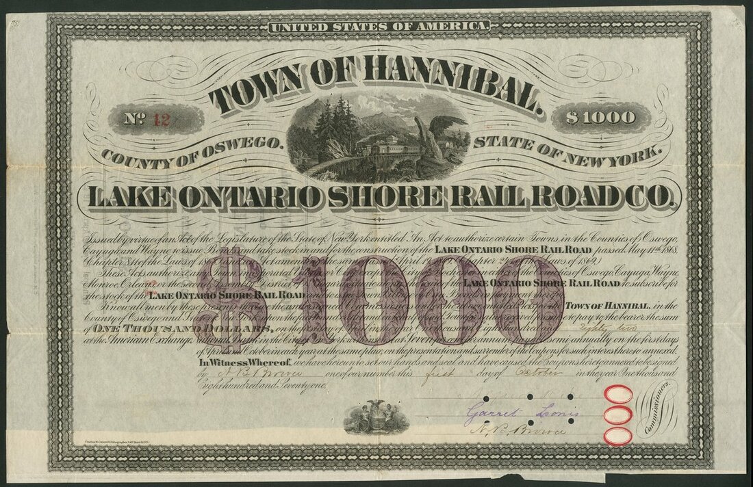 U.S.A: Lake Ontario Shore Rail Road Co., three Municipal bonds, $100 and $500 both issued by City of Oswego, and $1000, issued by the Town of Hannibal, all 1871, numbers 974, 520 and 12 respectively, vignette of railroad passing eagle in foreground, black with coloured values in underprint, all cancelled. NO RESERVE. All VF or thereabouts (3).