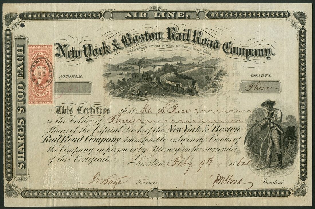 U.S.A: New York & Boston Rail Road Co., 'Air Line', $100 shares, 18[64], #761, railway line spanning river in centre, farmer with scythe bottom right, black. Chartered in 1846 building a line from Brookline, Mass to Woonsocket, Rhode Island and onwards to Blackstone. Acquired by the Boston, Hartford & Erie in 1865. Small filing hole top left, VF.