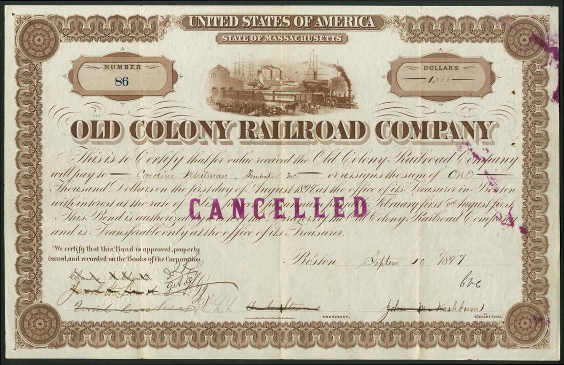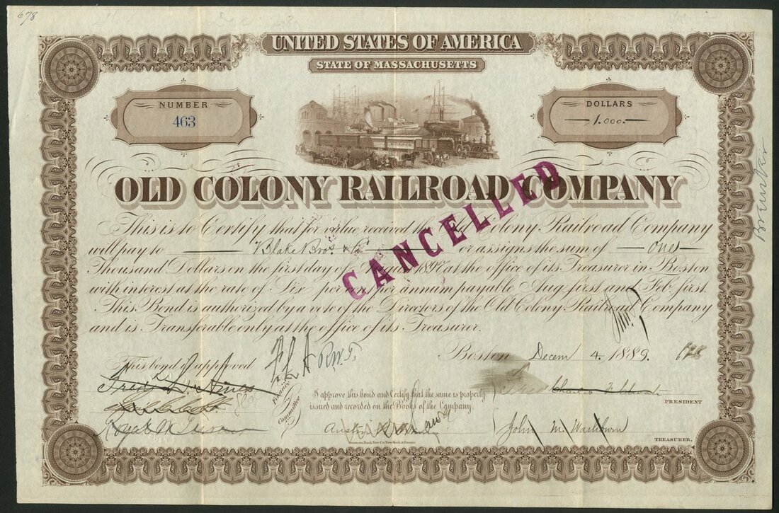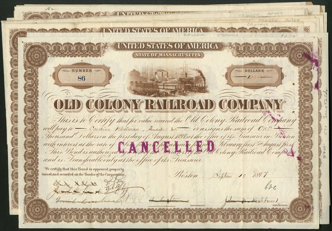 U.S.A.: Old Colony Rail Road Company, MA, a group of 19 registered 6% bonds for for various amounts in thousands of dollars, repayable by the 1st August 1897, dated 187[7]-187[80], numbered between 19 and 322, 14 examples, and dated 188[4]-188[94], numbered 374 to 528, 5 examples, serial numbers of different style, steam train by harbour, brown, some signed by Uriel Crocker, Onslow Stearns or Frederick Ames. All cancelled. Generally VF (19).