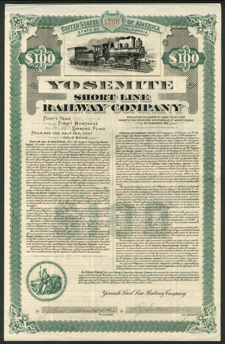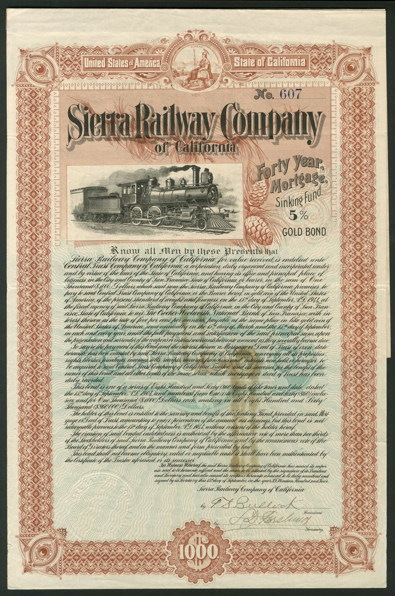 U.S.A: Pair of California Railroads, Yosemite Short Line Railway Co., $100 bond, 1905, #1766, engine at top, ornate border, green and black, with coupons, together with Sierra Railway Co. of California, 5% gold bond for $1000, 1904, #607, engine below title, ornate border, brown and black, with coupons. The first GVF, the latter with central stain as usual, VF. (2)