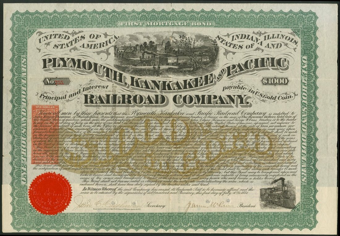 USA: Plymouth, Kankakee and Pacific Railroad Co., bond for $1000, 1871, #755, train passing through countryside at top, ornate border, black and green with gold underprint, printed by Henry Seibert & Bros., with coupons. Small edge tears on folds, VF.