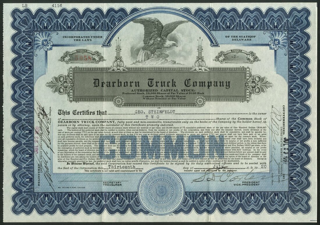 U.S.A: Dearborn Truck Company, common stock, 19[20], #5058, eagle above title, ornate border, blue and black. Produced the Ford-Dearborn One Ton Truck amongst others. AEF.