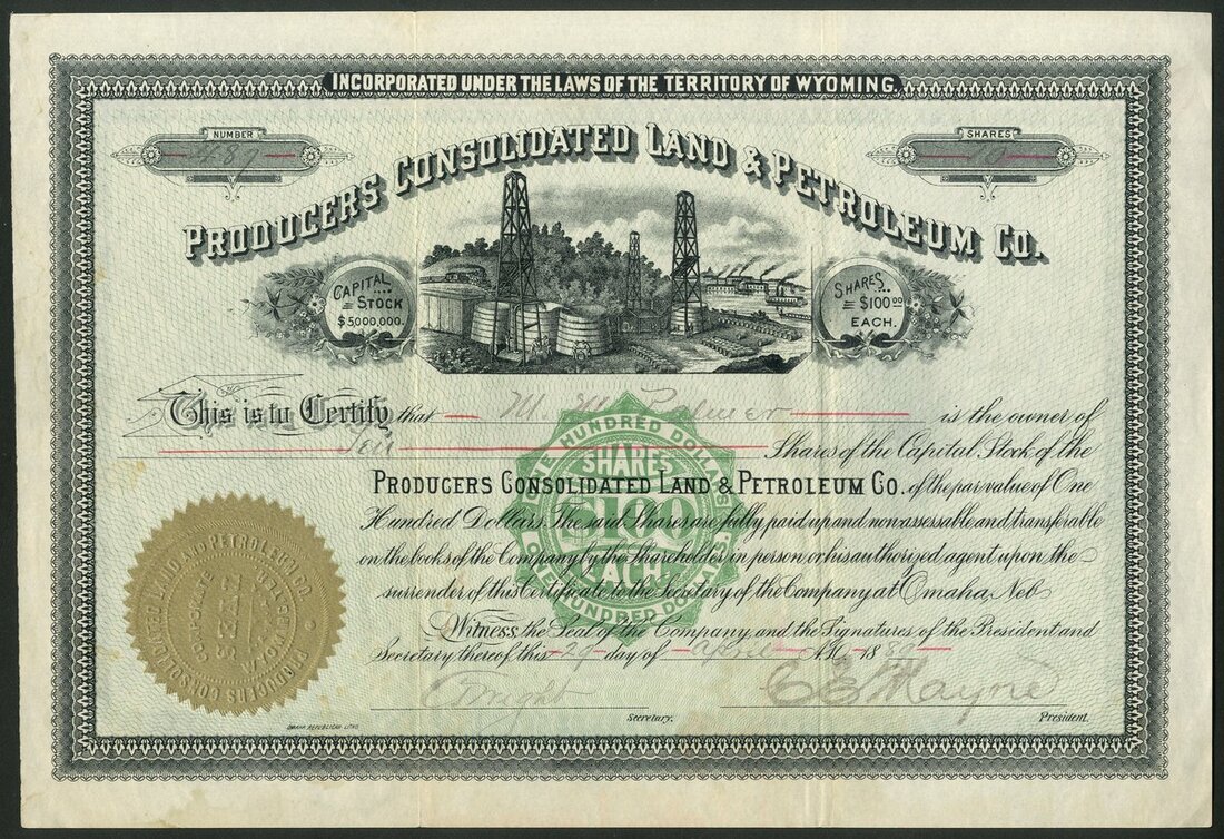 U.S.A: Producers Consolidated Land & Petroleum Co., $100 shares, 18[89], #489, central vignette of derricks and oil tanks with refinery behind, ornate border, black with green underprint. A significant proportion of stock in this company was included in the Standard Oil Trust agreement in 1882. Slight water marking at bottom, VF.