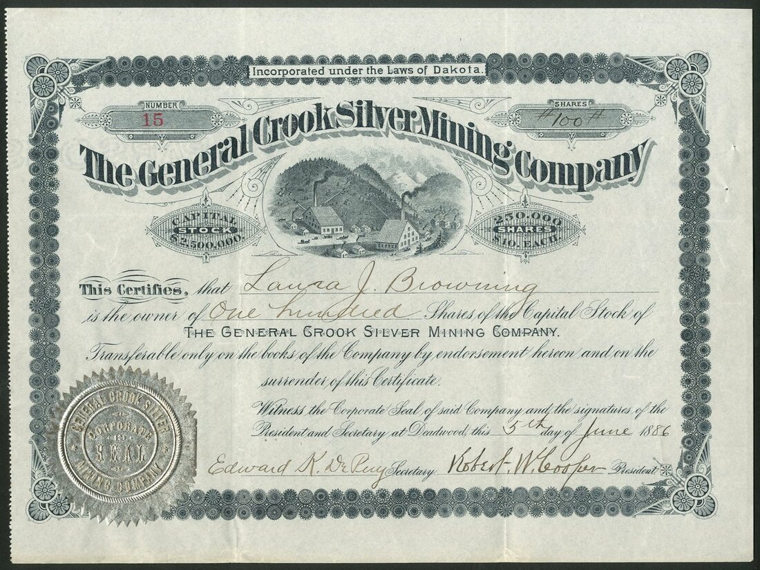 U.S.A: General Crook Silver Mining Co., $10 shares, 18[86], #15, mine site in centre, ornate border, black, silver seal. Works located at Galena, Lawrence County, Dakota. GVF.