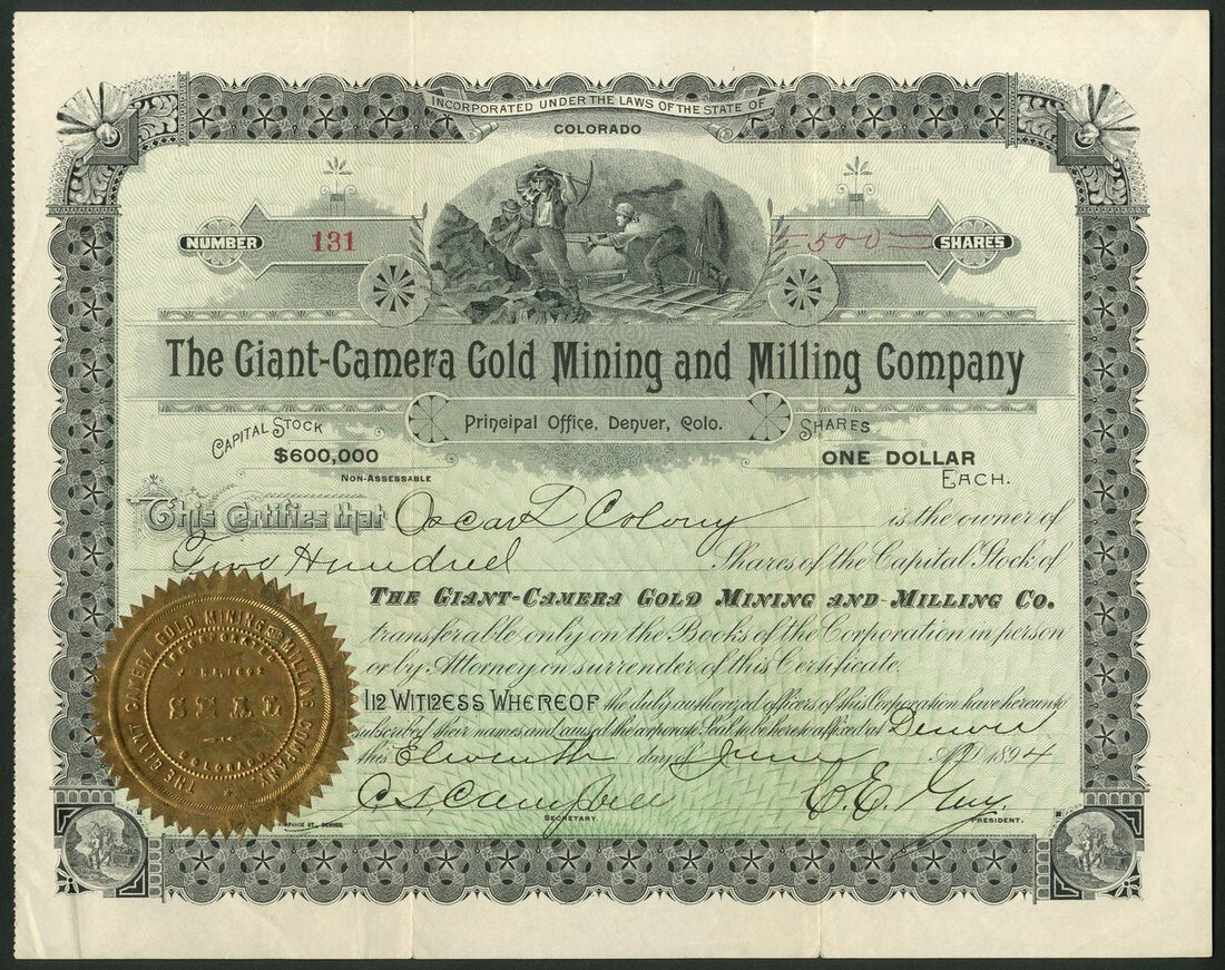 U.S.A: Giant-Camera Gold Mining and Milling Co., (CO), $1 shares, 189[4], #131, miners in shaft at top, ornate border, black with green underprint and gold seal. Small edge splits on folds, VF.