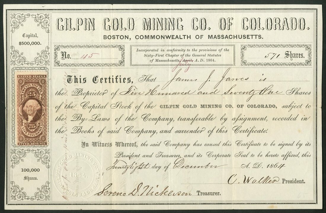 U.S.A: Gilpin Gold Mining Co. of Colorado, (MA), capital stock, 186[4], #45, black printing with scrollwork, revenue stamp at left. VF.