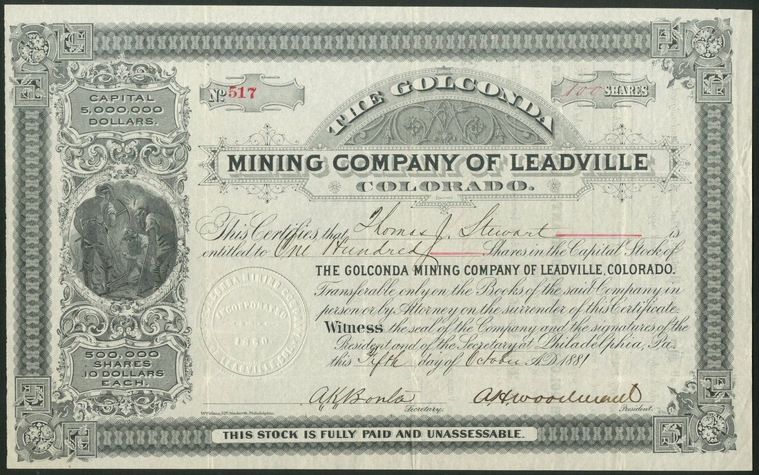 U.S.A: Golconda Mining Company of Leadville, Colorado, $10 shares, 188[1], #517, mine workers and scrollwork at left, ornate border, black. Works assumed to be in Leadville, Colorado. GVF.