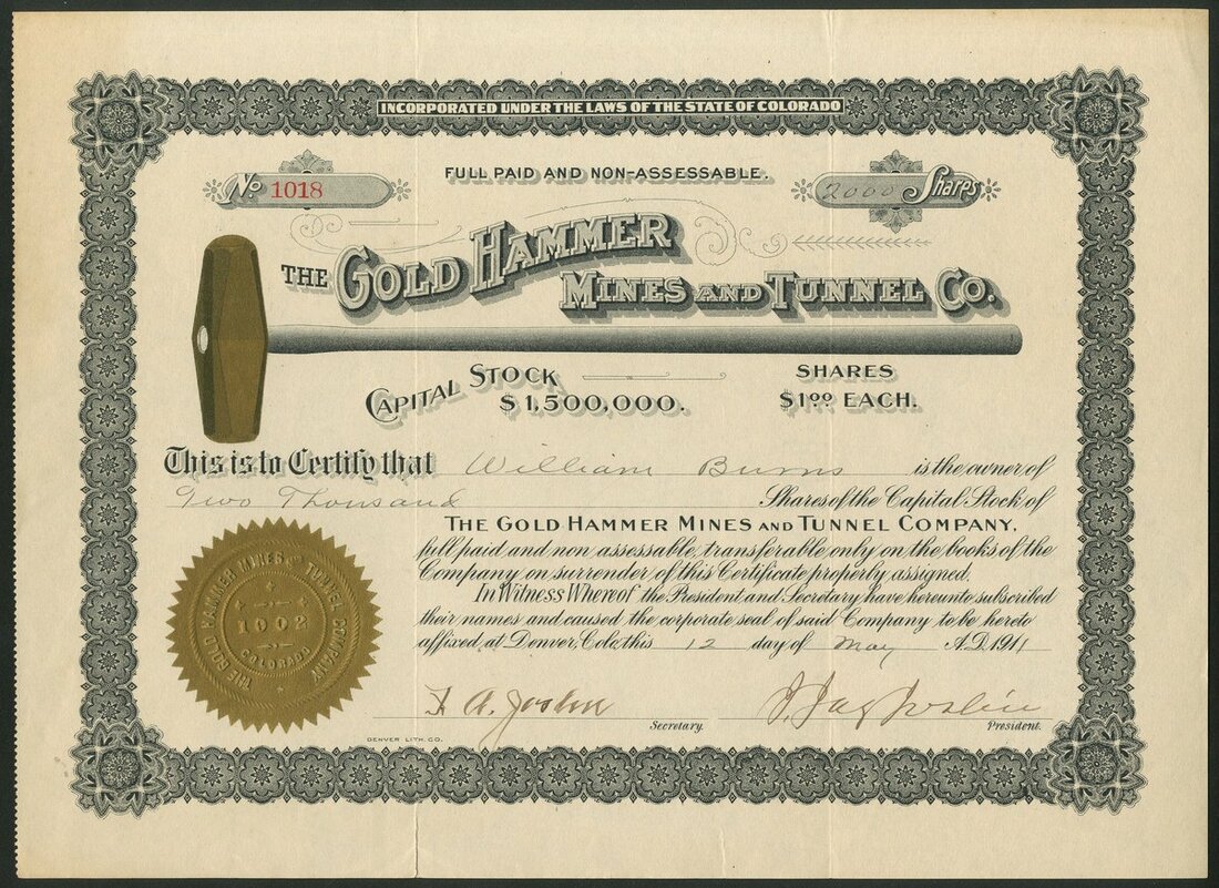 U.S.A: Gold Hammer Mines and Tunnel Co., $1 shares, 191[1], #1018, hammer underlining title, ornate border, black and gold. Owned 12 claims at Idaho Springs, Clear Creek County, Colorado. Edge tears at bottom, VF.