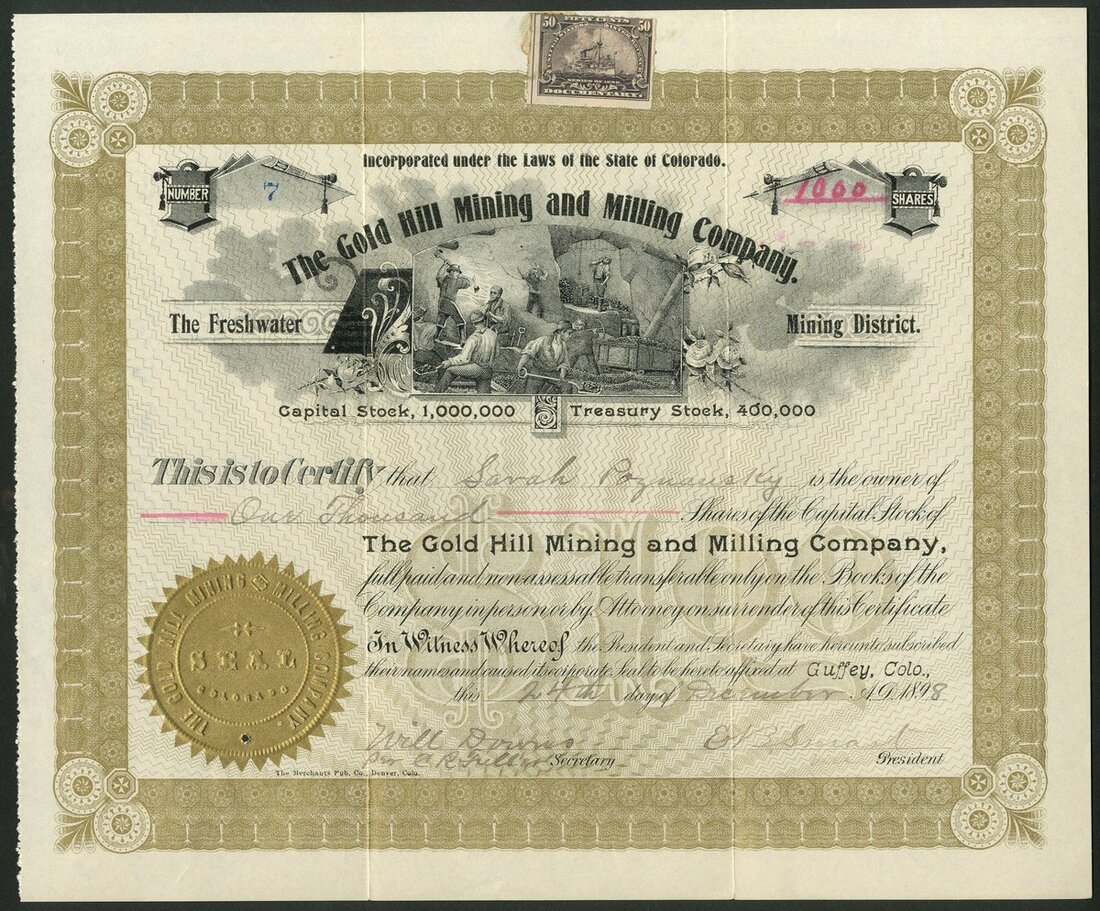 U.S.A: Gold Hill Mining and Milling Company, (CO), $1 shares, 189[8], #7, miners at work below title, ornate border, black and gold. Freshwater Mining District, Colrado. VF.