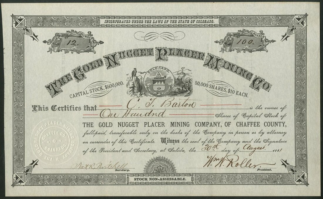 U.S.A: Gold Nugget Placer Mining Co. of Chaffee County, (CO), $10 shares, 188[1], #12, decorative title with Colorado state seal and mine site behind, ornate border, black. AEF.