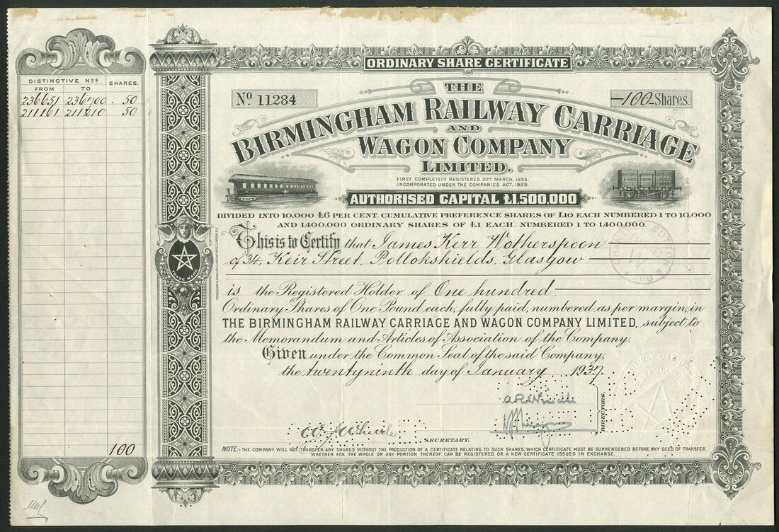 Great Britain: Birmingham Railway Carriage and Wagon Company Limited, £1 shares, 19[37], #11284, attractive piece with vignettes of passenger and goods railway carriages, black, printed by Waterlow & Sons, perforated cancelled. Originally founded in 1854 in Smethwick, Birmingham as the Birmingham Wagon Company, name changed in 1878. Primarily known for its excellent and extensive production of locomotives and carriages, the company also built Handley Page bombers and other aircraft during WWI and Churchill, Cromwell and Challenger tanks during WWII. VF and scarce.