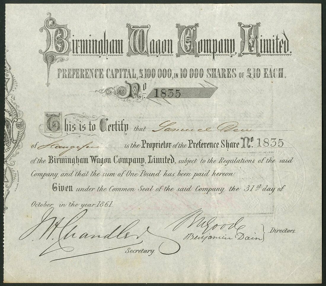 Great Britain: Birmingham Wagon Company Limited, £10 preference share, 1861, #1835, black. Originally founded in 1854 in Smethwick, Birmingham. Name changed to the Birmingham Railway Carriage and Wagon Company Limited in 1878. Primarily known for its excellent and extensive production of locomotives and carriages, the company also built Handley Page bombers and other aircraft during WWI and Churchill, Cromwell and Challenger tanks during WWII. EF and early issue. One small batch found to the same shareholder.
