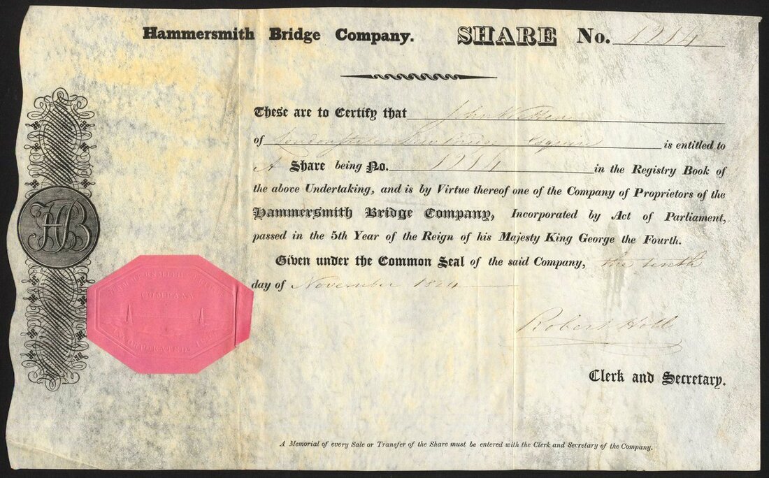 Great Britain: Hammersmith Bridge Company, certificate for one share, [1824], #1214, black printing, on vellum, pink paper embossed seal at left. Incorporated by Act of 1824. The first suspension bridge to be built over the Thames. Replaced in 1887 by a new structure as the old was too weak for the increased traffic. Minor discolouration, GVF [R9*].