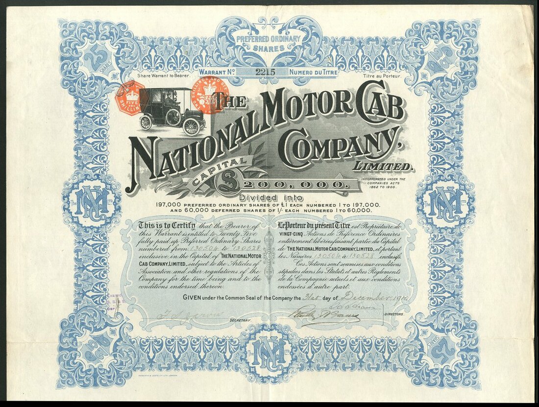 Great Britian: National Motor Cab Co. Ltd., bearer warrant for 25 preferred ordinary shares of £1, [1910], #2215, attractive large format piece with early motor cab at top left, ornate border, blue and black, with coupons. Based in Hammersmith, one of the largest operator with some 250 red coloured cabs supplied by French manufacturer UNIC. The boom in cabs was shortlived and the company had to reduce its fleet mainly by converting them to delivery trucks. The company was reorganised as National Motor Cab (1922) Ltd., and diversified into other areas of the motor trade becoming concessionaires for the KRC light car. GVF.