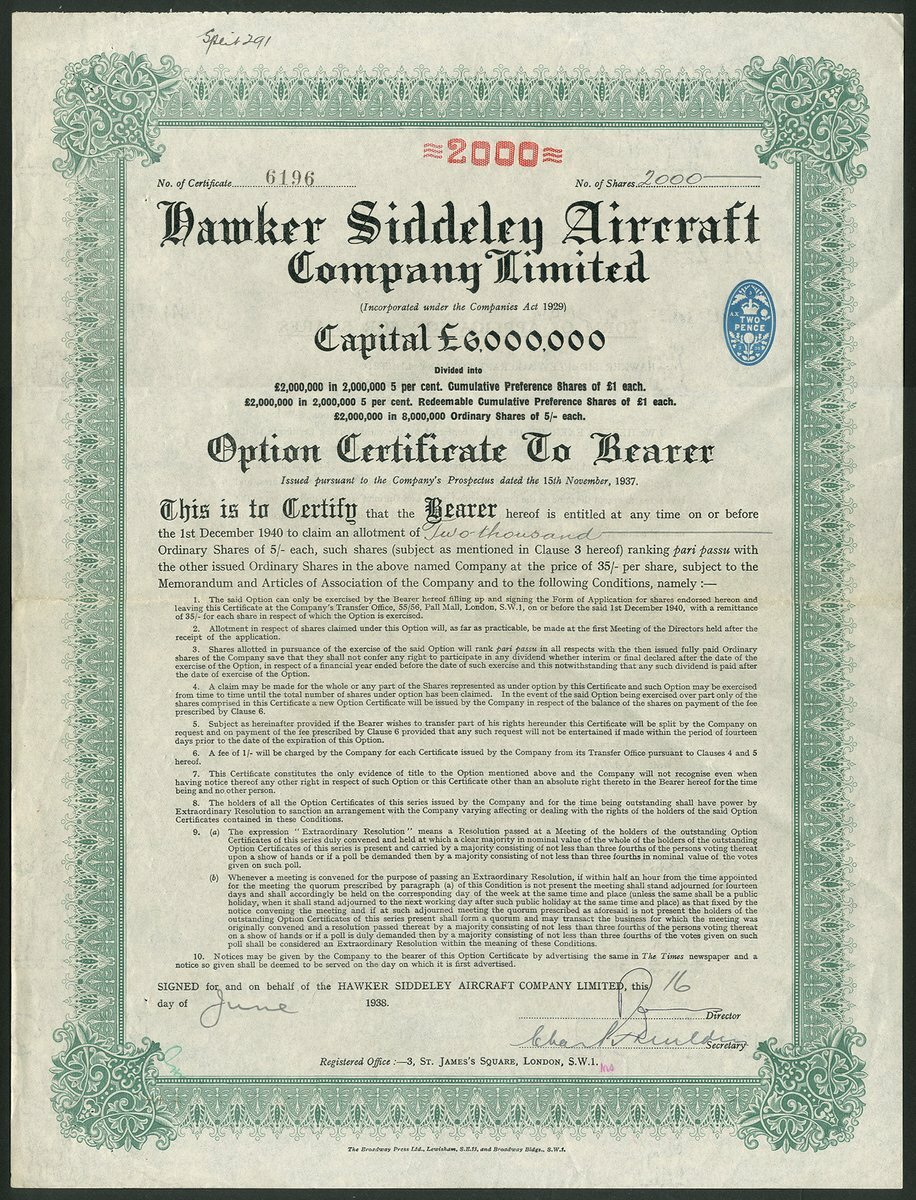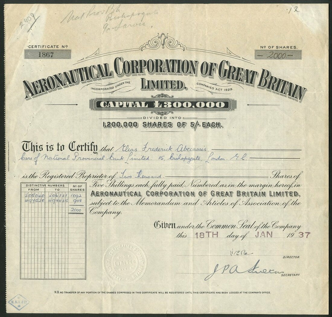 Great Britain: Aeronautical Corporation of Great Britain Ltd., 5/- shares, 1937, black, printed by Waterlow & Sons. Formed to acquire assets of Light Aircraft Ltd. & Lang Propellers Ltd., to manufacture a cabin aeroplane known as Aeronca-J.A.P. Factory at Peterborough. Together with an option certificate of the Hawker Siddeley Aircraft Co. Ltd., 1938. Both VF (2).