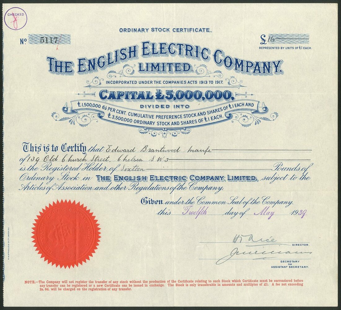 Great Britain: English Electric Company Limited, ordinary stock, 19[39], #5117, blue printing, red seal, differing somewhat from the previous lot. Formed in 1918 to amalgamate 5 businesses which had been producing armaments, munitions and aircraft during the War. Initially concentrated on electric motors, locomotives and diesel engines but later produced consumer electronics and especially aircraft. Produced the Canberra (B-57) jet bomber and Lightening jet fighter. Merged in 1960 to form British Aircraft Corporation (BAC). GVF and scarce.