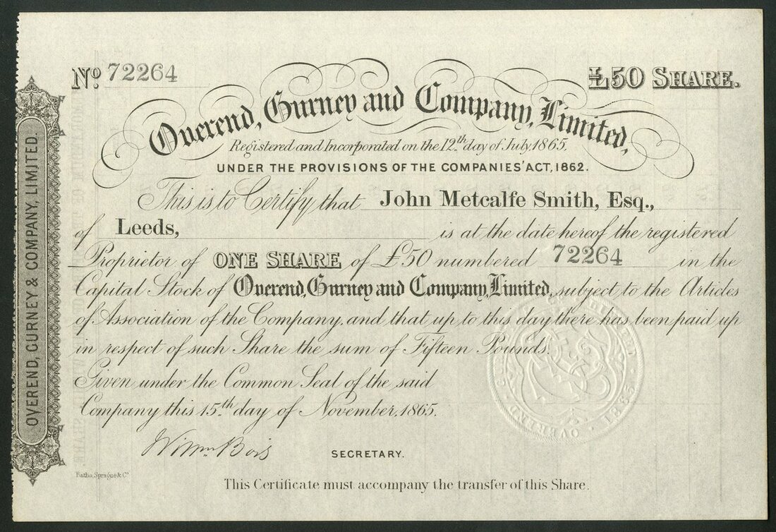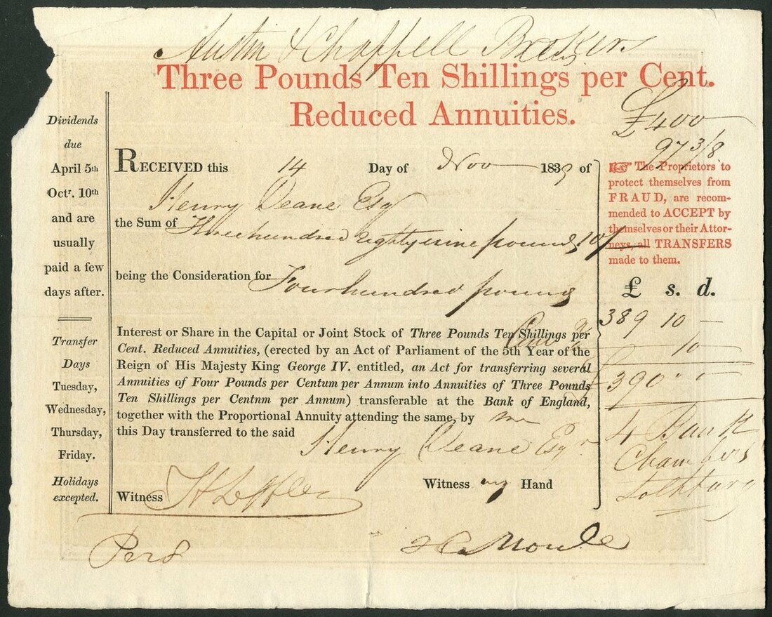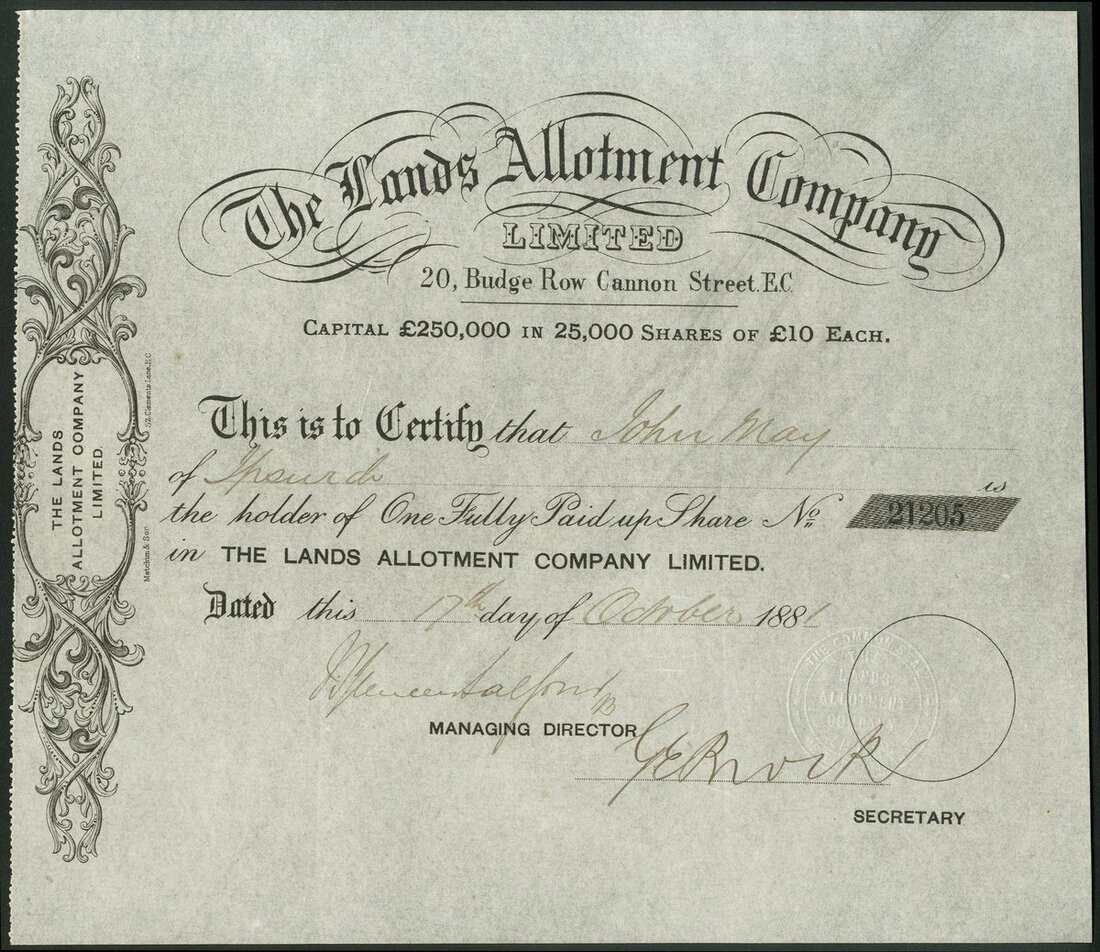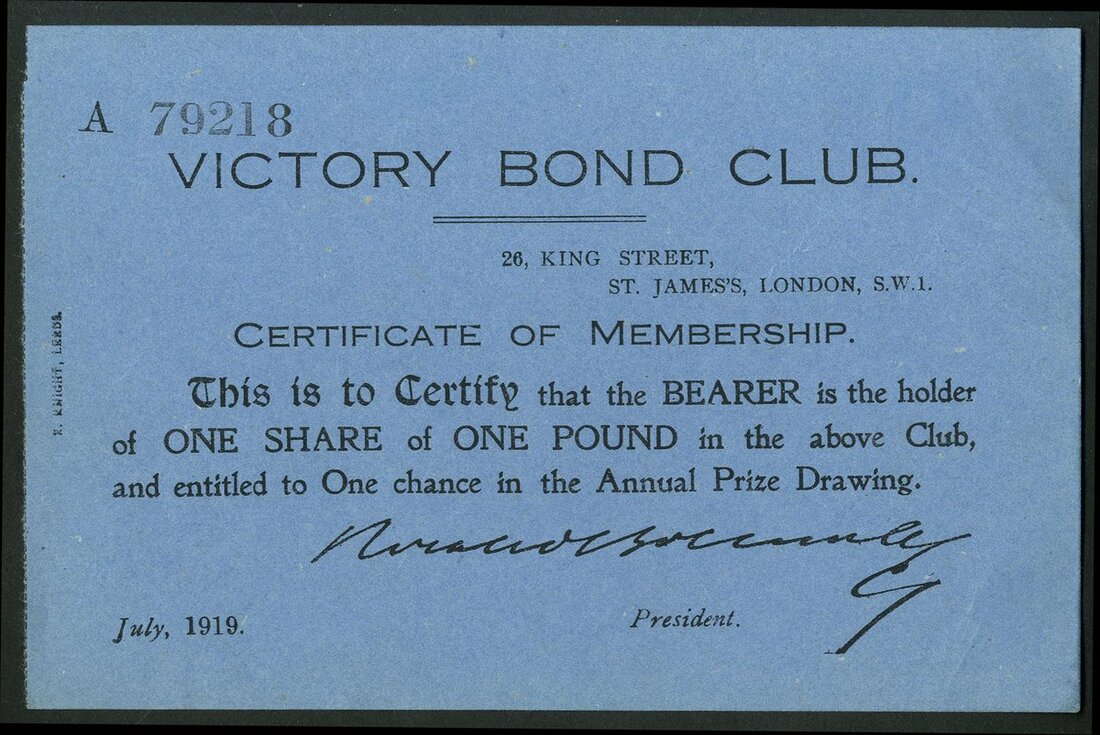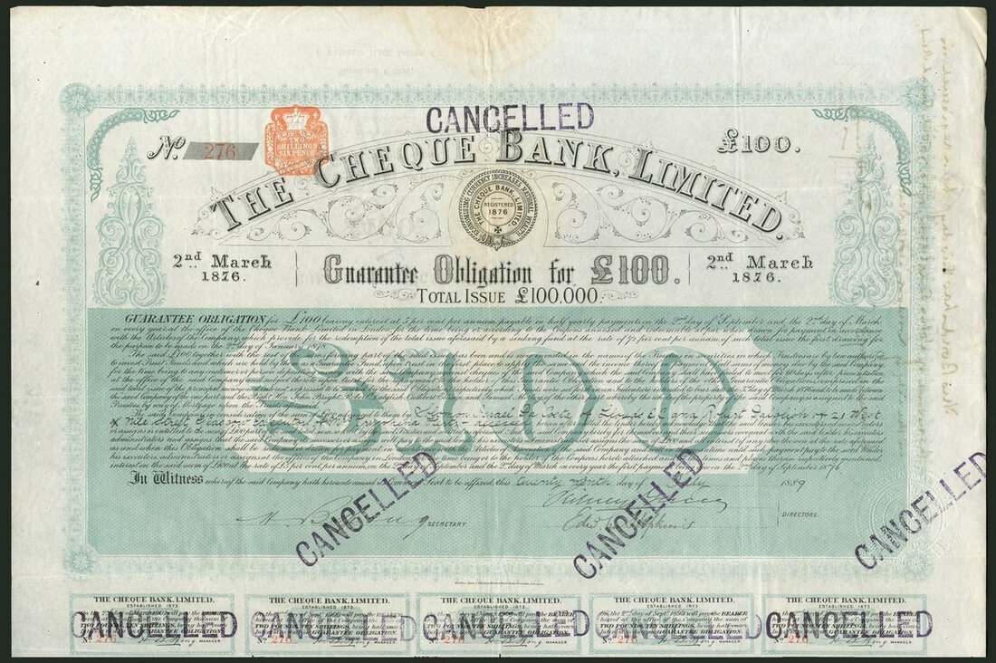 Great Britain: Cheque Bank Limited, £100 guarantee obligation, 18[89], large format, blue and black, with coupons, cancelled. Together with other financial companies comprising Overend, Gurney & Co. Ltd., 1865; Lands Allotment Co. Ltd., 188[1], 2 examples, both signed by Jabez Balfour; membership certificate for £1, 1919, of Horatio Bottomley's Victory Bond Club, and, an £3 10 shillings Reduced Annuities, inscribed stock certificate, 183[9]. this with usual damage to top corner, the remainder VF-EF (6),