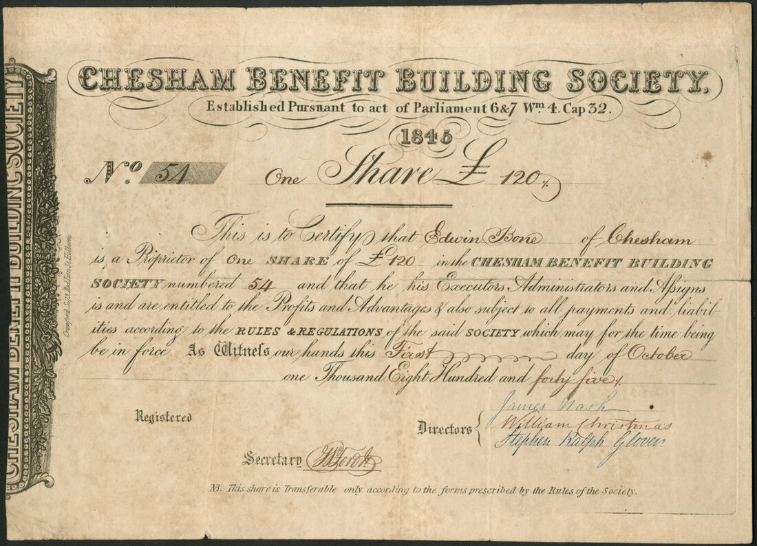 Great Britain: Chesham Benefit Building Society, one share of £[120], 18[45], #54, scrollwork at left, black on thick paper. Formed in 1845 and one of the oldest building societies still in existence before it merged with the Skipton Building Society in 2010. Repaired splits at folds, GF and rare.