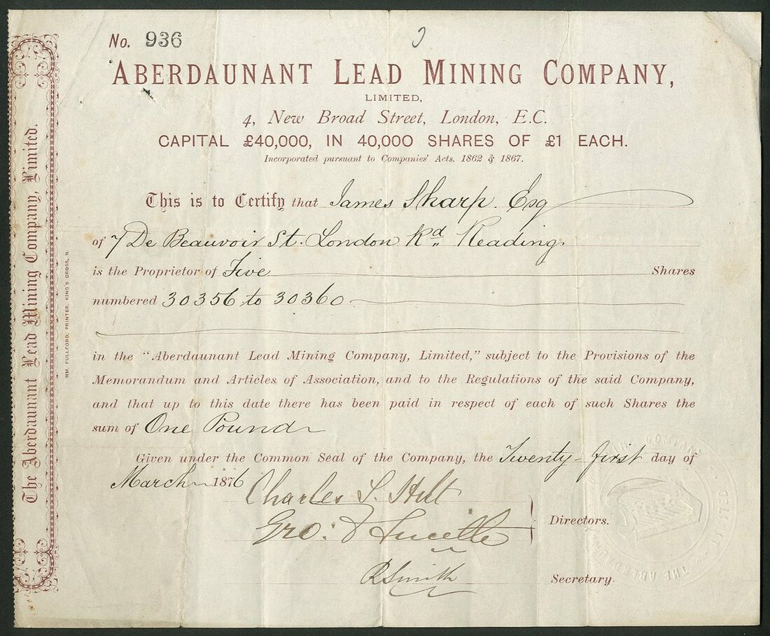 Great Britain: Aberdaunant Lead Mining Company Ltd., £1 shares, 187[6], #936, brown. Mines near Llanidloes, Powys. F-VF.
