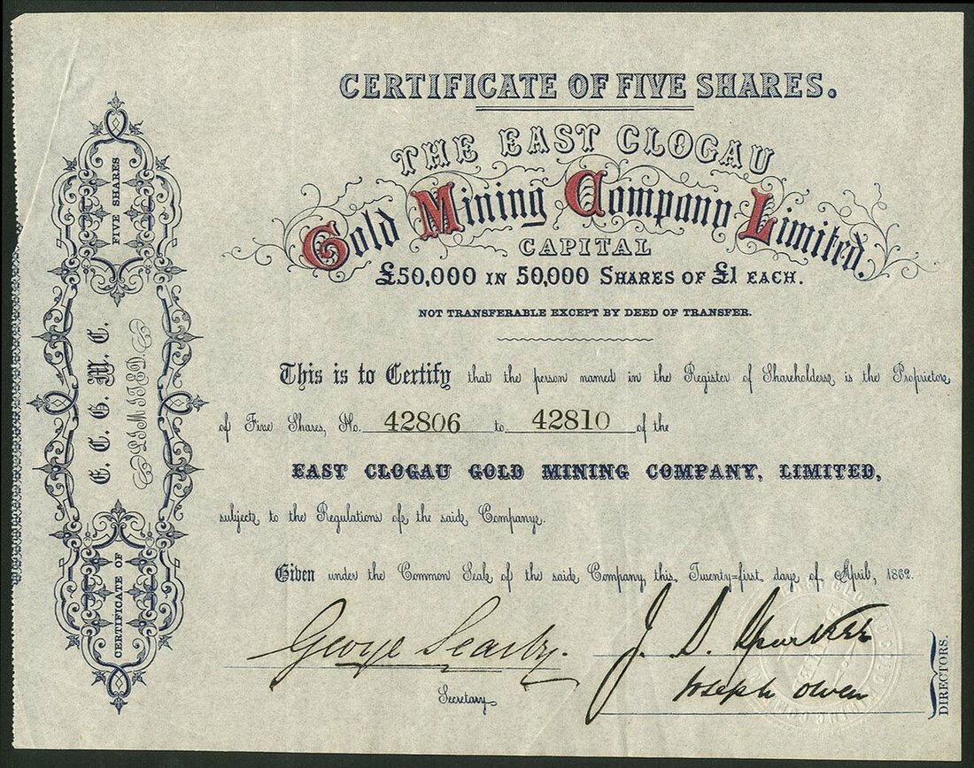 Great Britain: East Clogau Gold Mining Co. Ltd., 5 shares of £1, 1862, #42806-10, blue and red. Registered in 1862 to mine for gold in the parish of Llanelltyd, Merionethshire but failed in the panic of 1866. One of the handful of companies mining gold in this region of Wales. GVF.