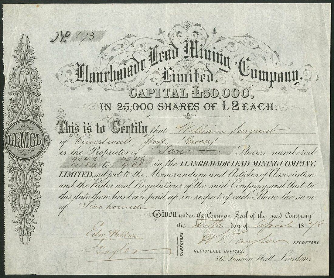 Great Britain: Llanrhaiadr Lead Mining Co. Ltd., £2 shares, 18[78], #173, scrollwork at left, black. Ancient lead mines in Mongomeryshire which were reworked from the 17th century on a small scale. Passed through the hands of several companies which failed to make much profit. Finally closed and flooded around 1901. VF and scarce.