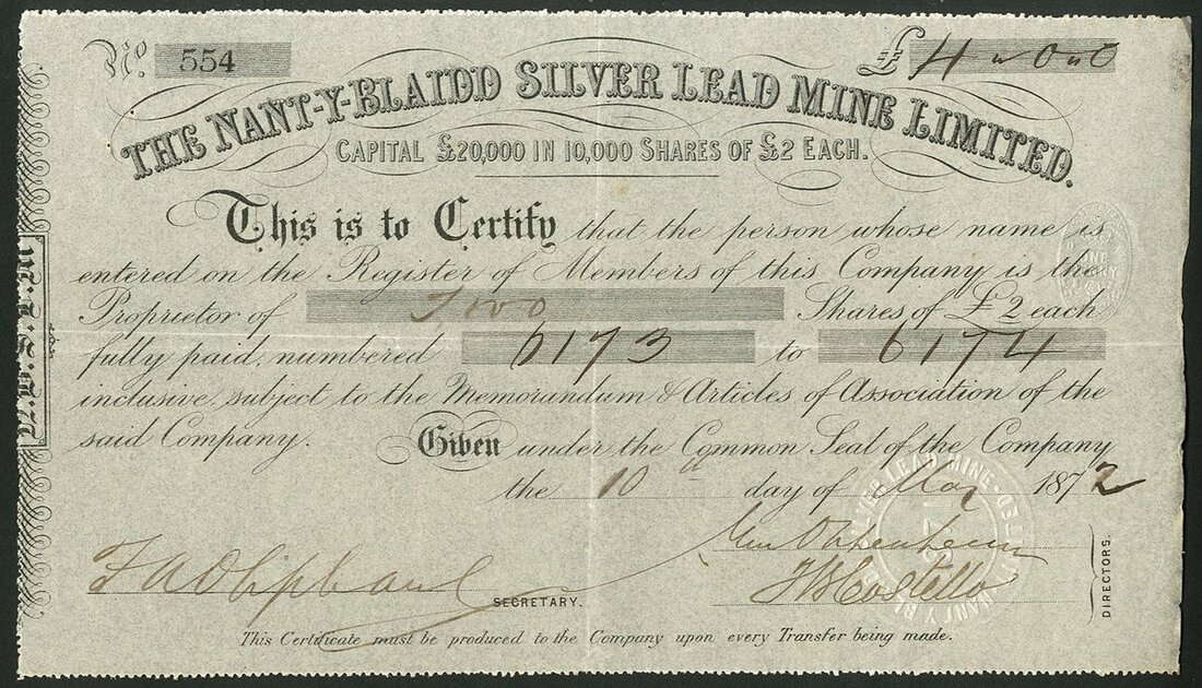 Great Britain: Nant-y-Blaidd Silver Lead Mine Limited, £2 shares, 187[2], #554, black. Registered in 1871 to acquire a 300 acre property in Montgomeryshire. In liquidation by the end of 1872 and re-registered as the New Nant-y-Blaidd Silver Lead Mine Ltd. in 1873 with a slightly reduced capital. VF and rare.