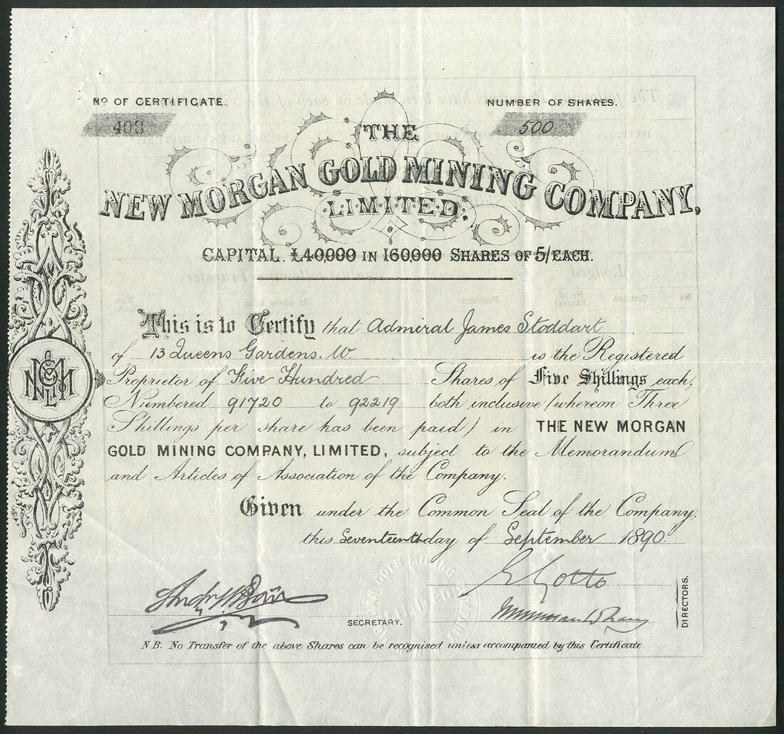Great Britain: New Morgan Gold Mining Co. Ltd., 5/- shares, 18[91], #408, scrollwork at left, black. Owned and operated the Gwynfyndd Mine at Dolgellau, North Wales. VF and rare. We sold a similar piece #592 for £240 in 2016.