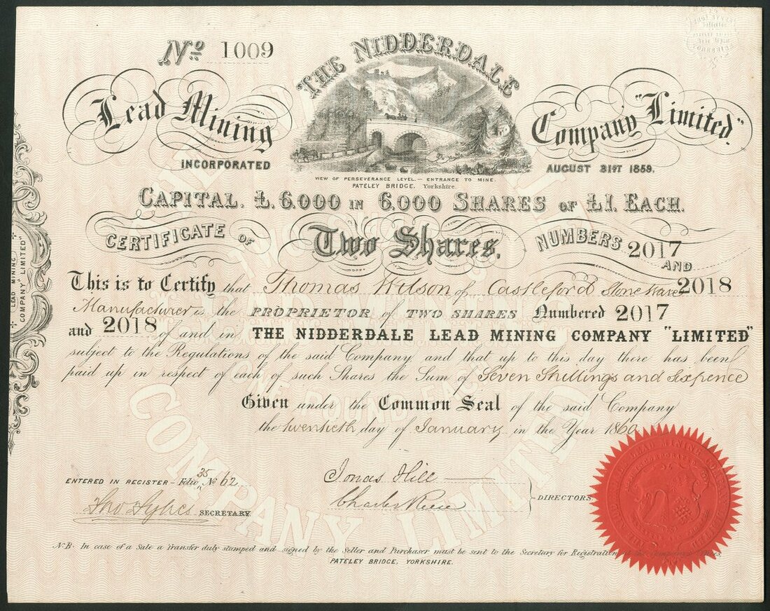 Great Britain: Nidderdale Lead Mining Co. Ltd., 2 shares of £1, 18[60], #1009, attractive vignette of mine entrance at Pateley Bridge, Yorkshire, black with pink underprint, red seal. Much more scarce than the usual preference shares which although of similar design is somewhat smaller. EF.
