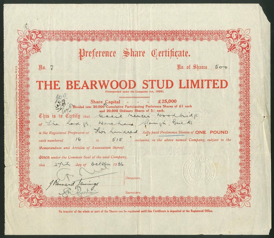 Great Britain: Bearwood Stud Limited, £1 preference shares, 19[36], #7, ornate border, red. Some minor edge damage but AVF and rare.