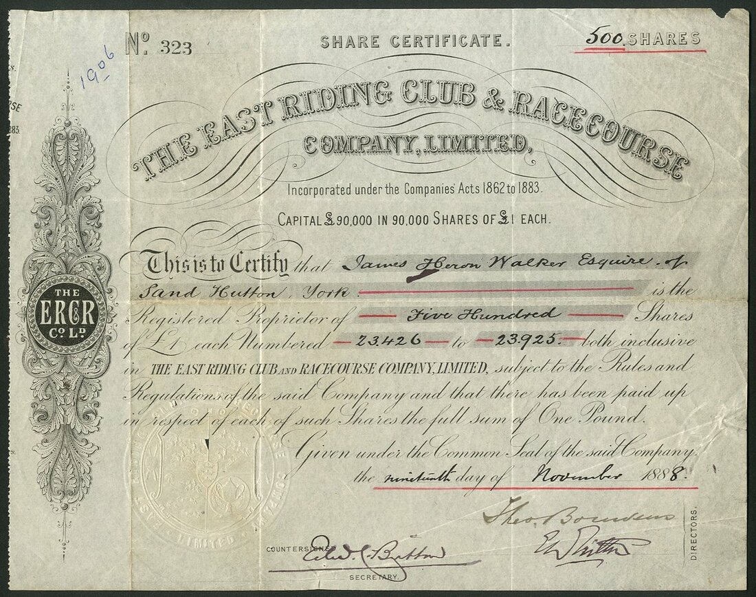 Great Britain: East Riding Club & Racecourse Company Limited, £1 shares, 188[8], #323, scrollwork at left, black. A little discoloured at left, AVF and rare.