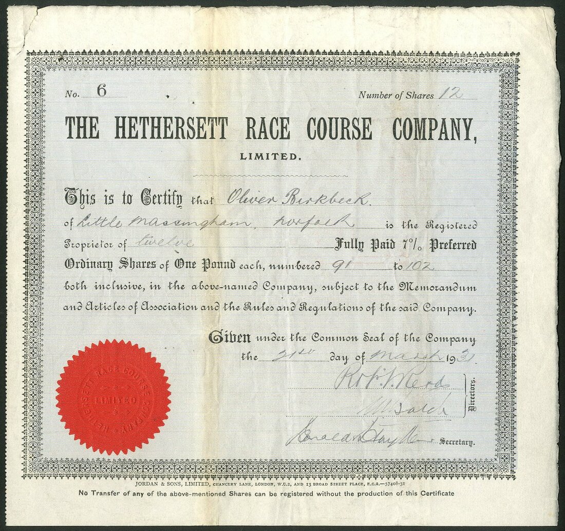 Great Britain: Hethersett Race Course Company Limited, £1 preferred ordinary shares, 19[31], #6, ornate border, black, blue underprint, red seal. Tear at top left corner, discolouration along fold, AVF.