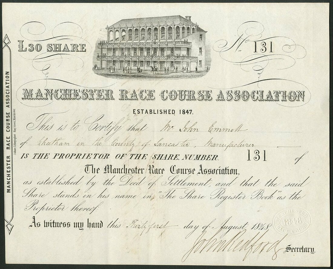 Great Britain: Manchester Race Course Association, one £30 share, 1848, #145, large vignette of the grandstand, black. Formed following the closure of racing at Kersal Moor, acquiring land at Castle Irwell where the large grandstand was built. When the landlord died his son refused to renew the lease when it expired in 1867 'for just and Christian reasons'. However when the son also died the Race committee bought the site from the executors in 1898. GVF and rare.