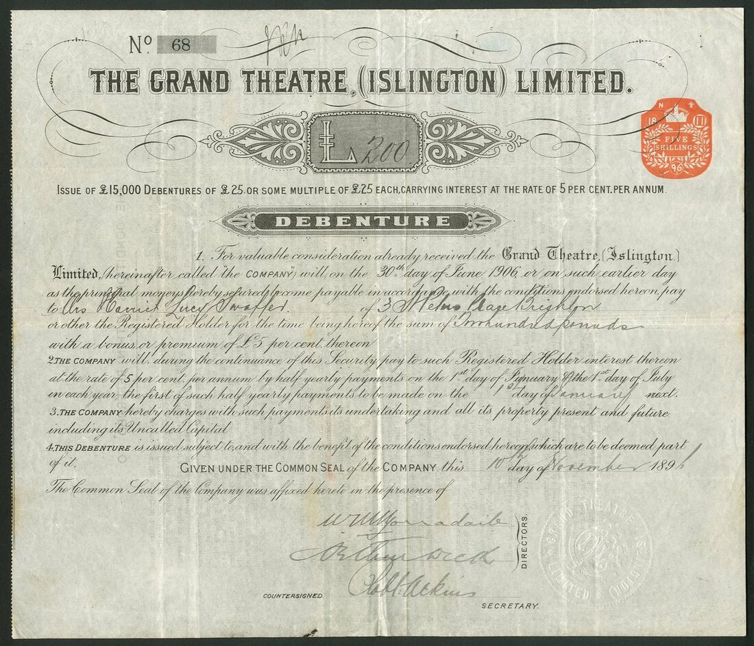 Great Britain: Grand Theatre (Islington) Limited, 5% debenture for £[200], 189[6], #68, black. The second Grand Theatre built on the site, originally occupied by the Philharmonic Hall in 1860 which was destroyed by fire in 1882. The first Grand Theatre which replaced it also burnt down in 1887. The theatre to which this document relates was built in 1888 and seated 3000 people and was one of the largest in London. It however met a similar fate and burnt down in 1900! It was replaced by a further theatre, renamed Islington Empire in 1908 and then in the 1930 became a part of the ABC Cinema group. Demolished in 1981 to make way for a branch of the Royal Bank of Scotland. AVF and rare.