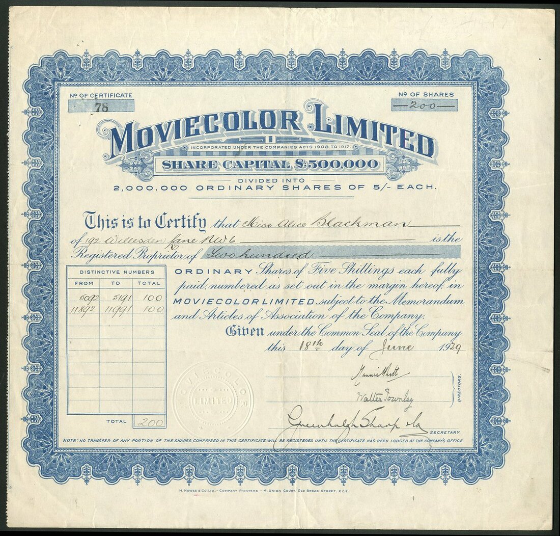 Great Britain: Moviecolor Limited, 5/- shares, 19[29], #78, signed by Sir Walter Townley and the Hon. Maurice Brett as directors, ornate border, blue. Formed in 1929 to acquire the rights and licenses from the Keller Dorian Company for use of its cinematograph apparatus. The company was obliged to acquire 20% of the Keller Dorian shares in exchange. Sir Walter Beaupré Townley, 1863-1945, diplomat and minister to many countries including Roumania, Persia and the Netherlands, the latter in 1917 to 1919. Lt. Col. the Hon. Maurice Vyner Baliol Brett, 1882-1934, 2nd son of Viscount Esher. VF and a scarce piece of cinema history.