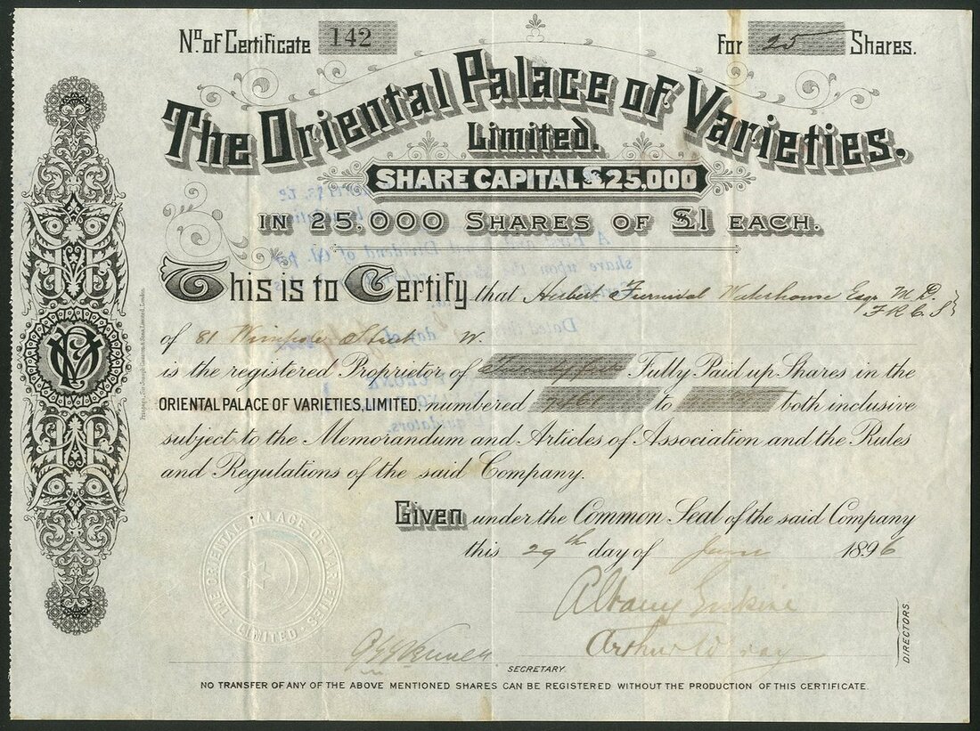 Great Britain: Oriental Palace of Varieties Limited, £1 shares, 189[6], #142, signed by Albany Erskine as director, scrollwork at left, black. Formed to acquire the Golden Lion public house and adjoining properties on Denmark Hill, Camberwell Green and to build a new theatre of varieties capable of seating about 2000 people. The Hon. Albany Mar Stuart Erskine, 1852-1933, son of the 13th Earl of Buchan. Liquidators endorsement on reverse. VF.