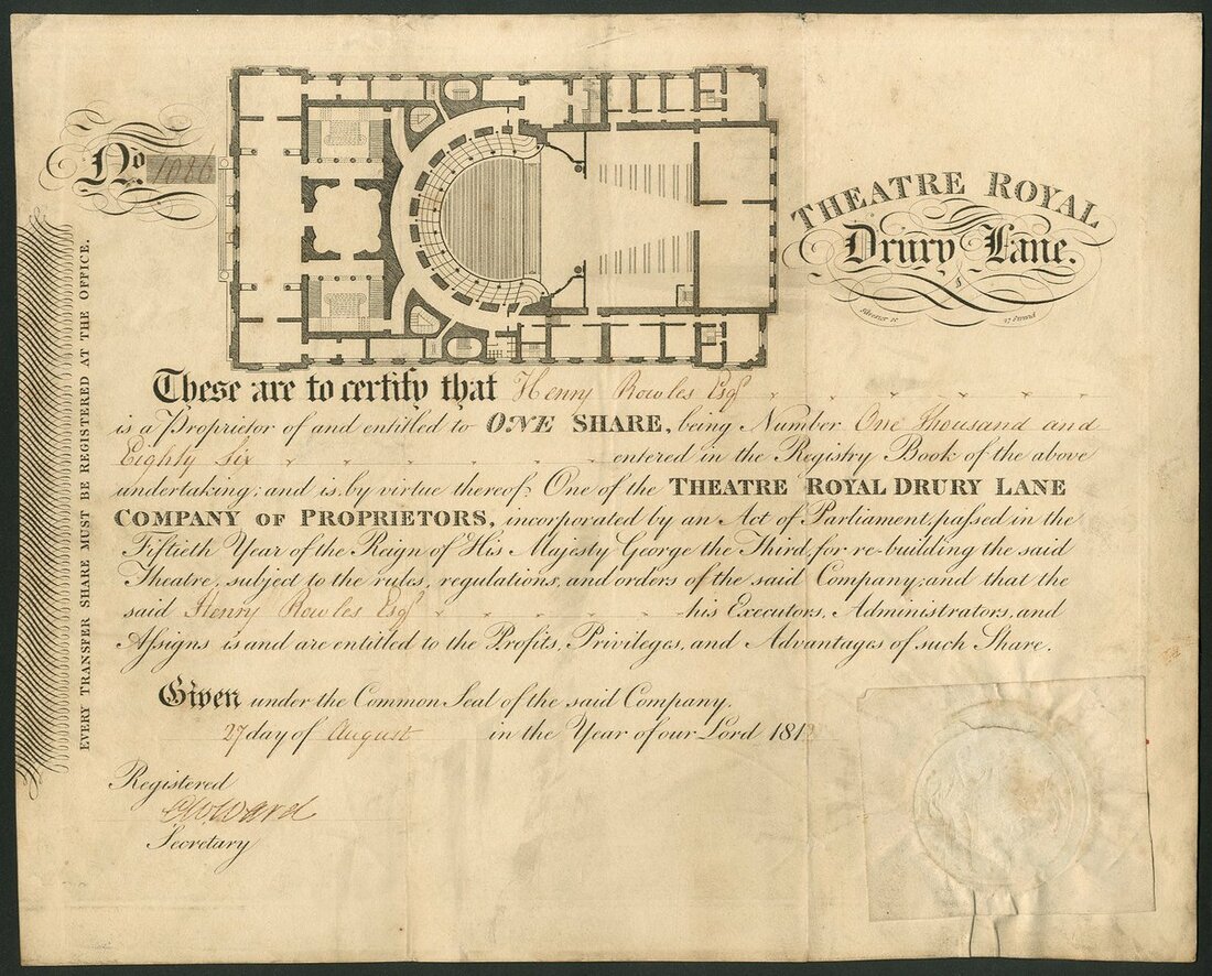 Great Britain: Theatre Royal, Drury Lane, certificate for 1 share, 181[2], #1086, large plan of the theatre at top left, title to right, black on thick paper, paper seal at bottom right. The company was formed following the disastrous fire of 1809 that destroyed the previous structure. The new theatre, designed by Benjamin Wyatt, opened in 1812. A restoration project was announced in 2013 by Andrew Lloyd-Webber's Really Useful Theatres group who own the theatre. Usual two folds, VF but grubby surface.