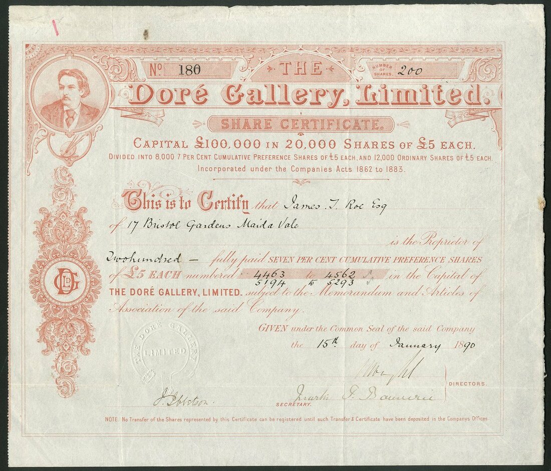 Great Britain: Doré Gallery Limited, £5 preference shares, 18[90], #180, vignette of French artist Gustave Doré at top left, red. The Gallery was formed primarily to exhibit the works of Gustave Doré at 35, New Bond Street, London in 1868, the company was formed in the 1880's. Wider exhibitions were held until 1913 when the gallery closed. The building was acquired by auctioneers Sotheby's in 1917 as their London headquarters. VF and rare. the only example known.