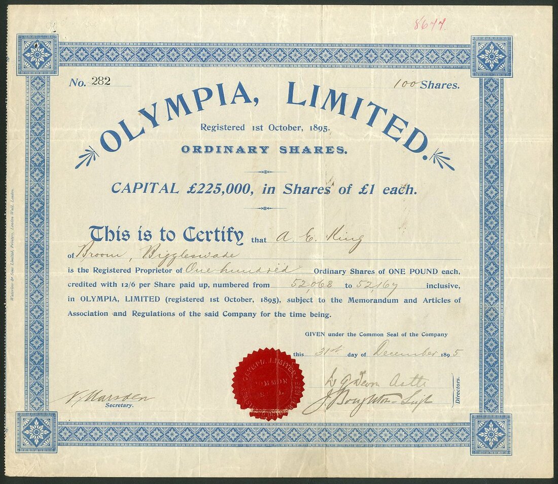 Great Britain: Olympia Ltd., £1 shares, 12/6d paid, 189[5], #282, ornate border, blue, red paper seal, printed by Waterlow & Sons. Opened in Kensington, West London 1884 as the National Agricultural Hall but changed its name in 1886 when the Paris Hippodrome was first staged there. This company was in liquidation in 1897 but the building continues until today. Many other shows put on and since 1905 has been a venue for major exhibitions, such as the Motor Show, International Horse Show, Ideal Home Exhibition and Cruft's Dog Show. Joseph Lyons later Sir Joseph was a major caterer for such events and was a director of the company. He became best known for his Lyons Corner Houses which dominated British streets until the 1950's. AVF.