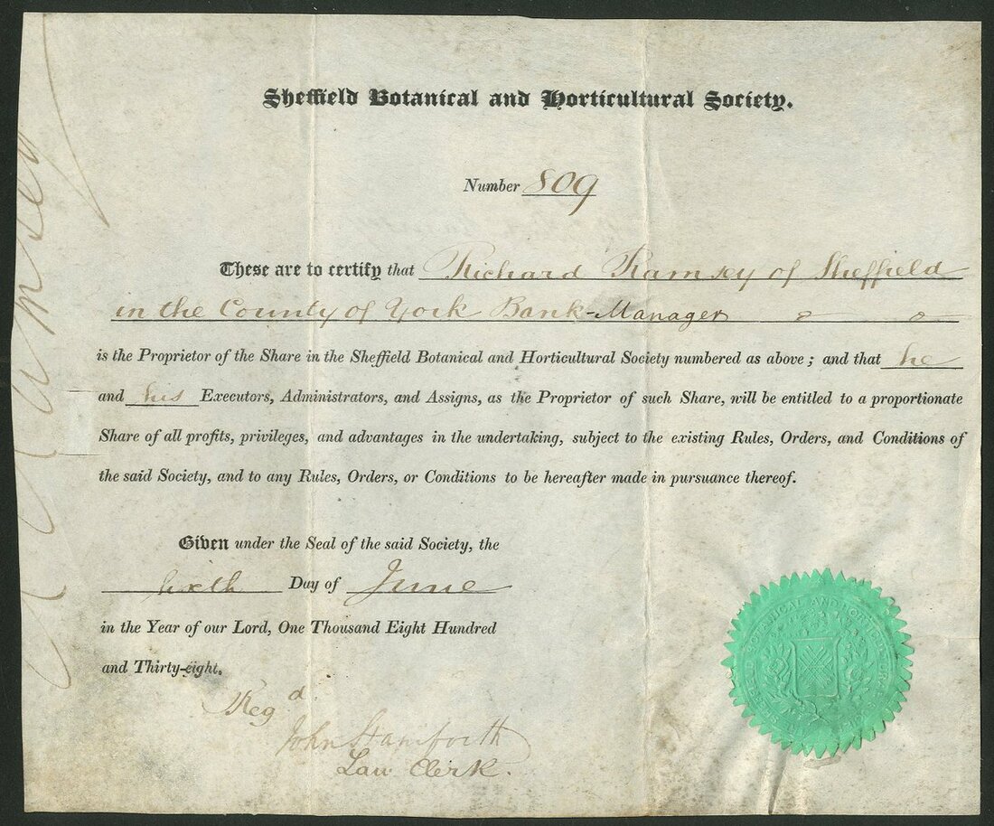 Great Britain: Sheffield Botanical and Horticultural Society, certificate for one share, 1838, #809, black printing, on vellum, green paper seal attached. VF and very rare. First time at auction.