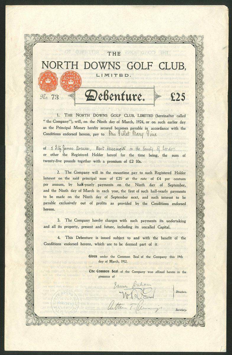 Great Britain: North Downs Golf Club, Limited, 5/- shares, 191[2], #42, ornate border, brown. Together with £25 debenture, also 1912, black, 4 pages. Formed in 1899 at Woldingham, near Caterham, Surrey. Still in existence. GVF(2).