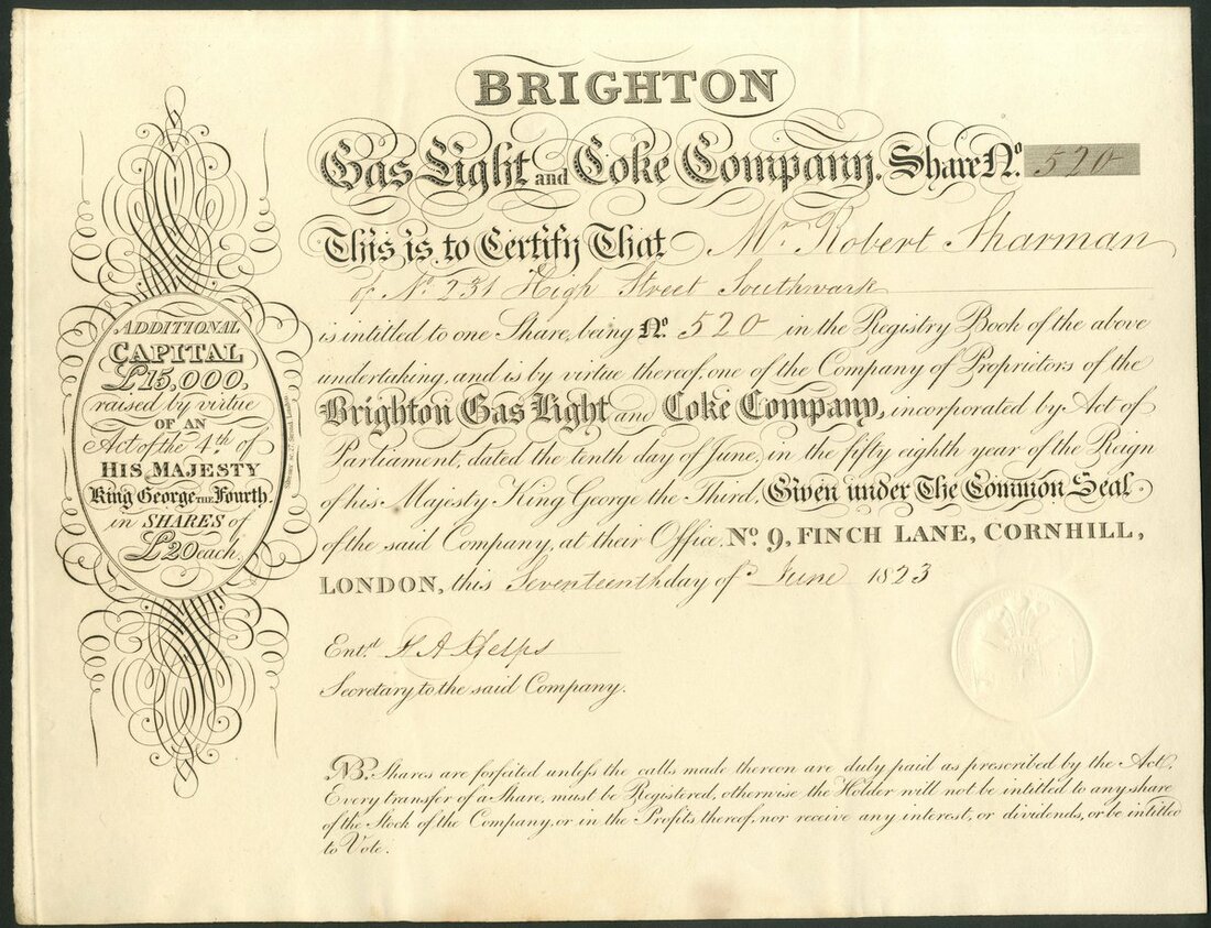 Great Britain: Brighton Gas Light & Coke Company, £20 share, 18[23], #520, black, attractive printing. GVF.